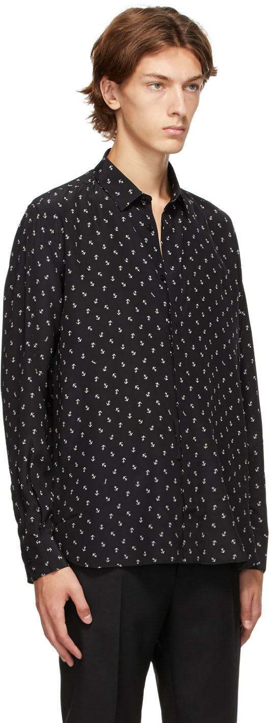 Long sleeve silk crepe shirt in black featuring graphic pattern in white throughout. Spread collar. Button closure at front. Single-button barrel cuff. Shirttail hem. Supplier color: Black/Chalk 100% silk. Brand: Saint Laurent