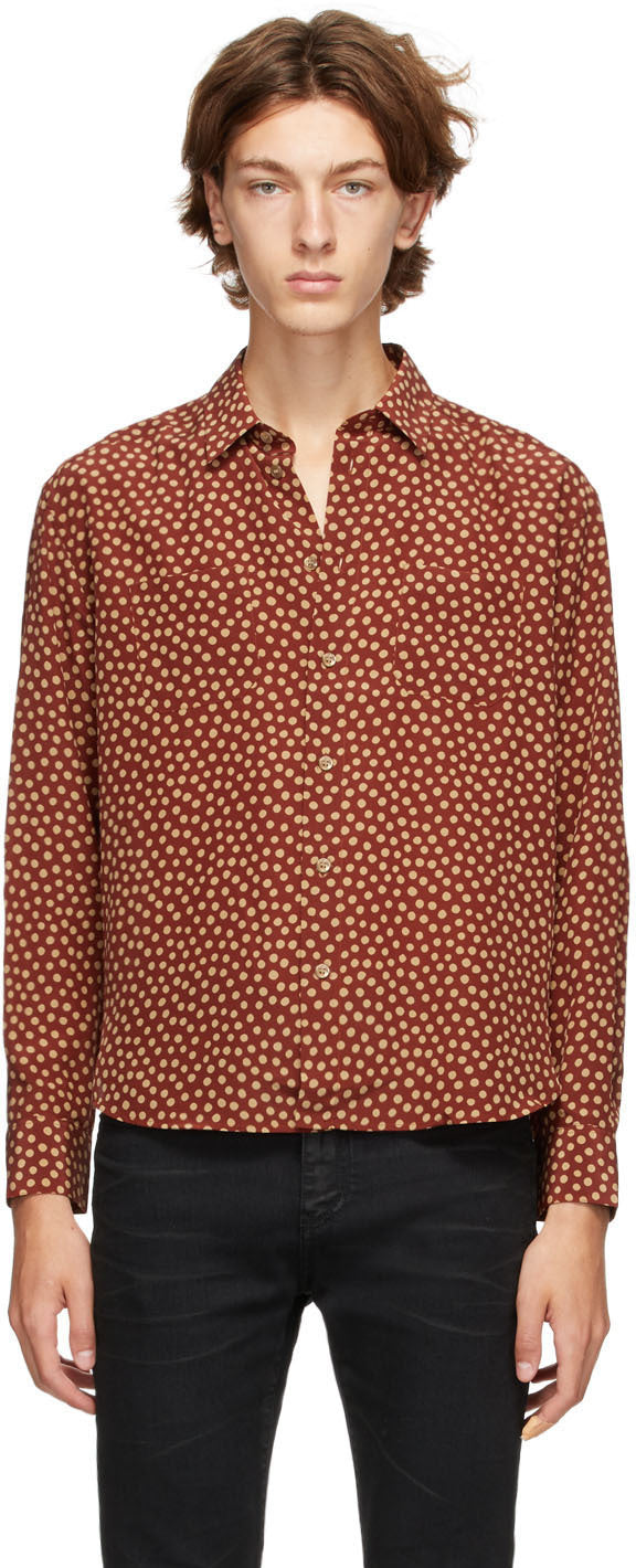 Long sleeve silk crepe shirt in brown featuring polka dot pattern in tan throughout. Spread collar. Button closure at front. Patch pockets at chest. Box pleat at back. Single-button barrel cuffs. Shirttail hem. Supplier color: Brown 100% silk. Brand: Saint Laurent