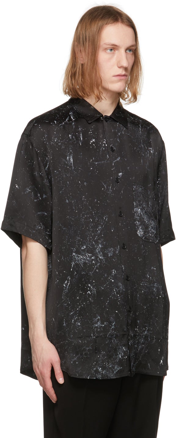 Short sleeve viscose satin shirt in black featuring paint splatter-effect in white. Spread collar. Button closure at front. Patch pocket at chest. Shirttail hem. Supplier color: Black 100% viscose. Brand: Song for the Mute