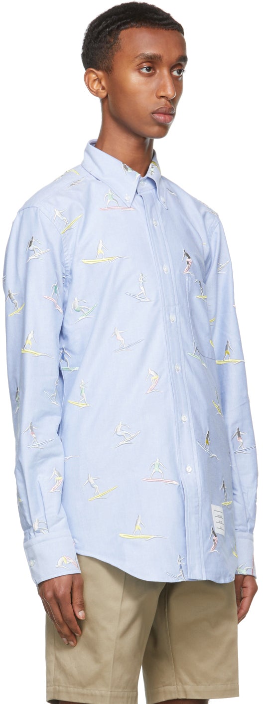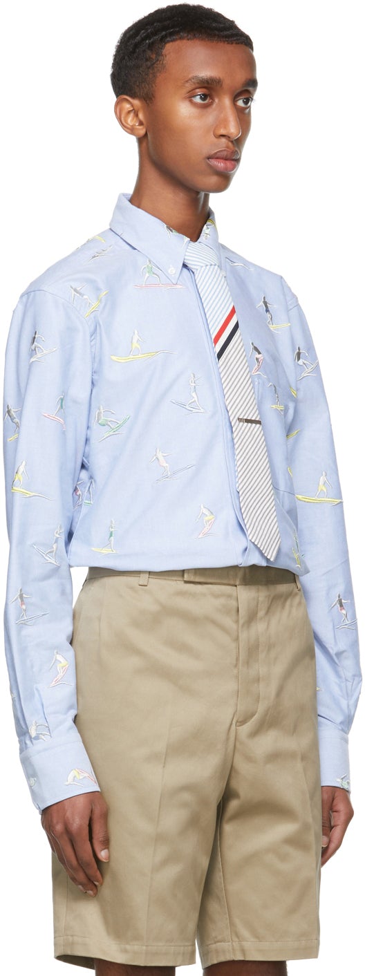 Long sleeve cotton and viscose-blend Oxford cloth shirt in blue. Graphics embroidered in multicolor throughout. Button-down spread collar. Button closure at front. Patch pocket at chest. Textile logo patch in white at front hem. Single-button barrel cuffs. Signature tricolor grosgrain flag at back collar. Locker loop at back yoke. Shirttail hem. Supplier color: Light blue 80% cotton, 20% viscose. Brand: Thom Browne