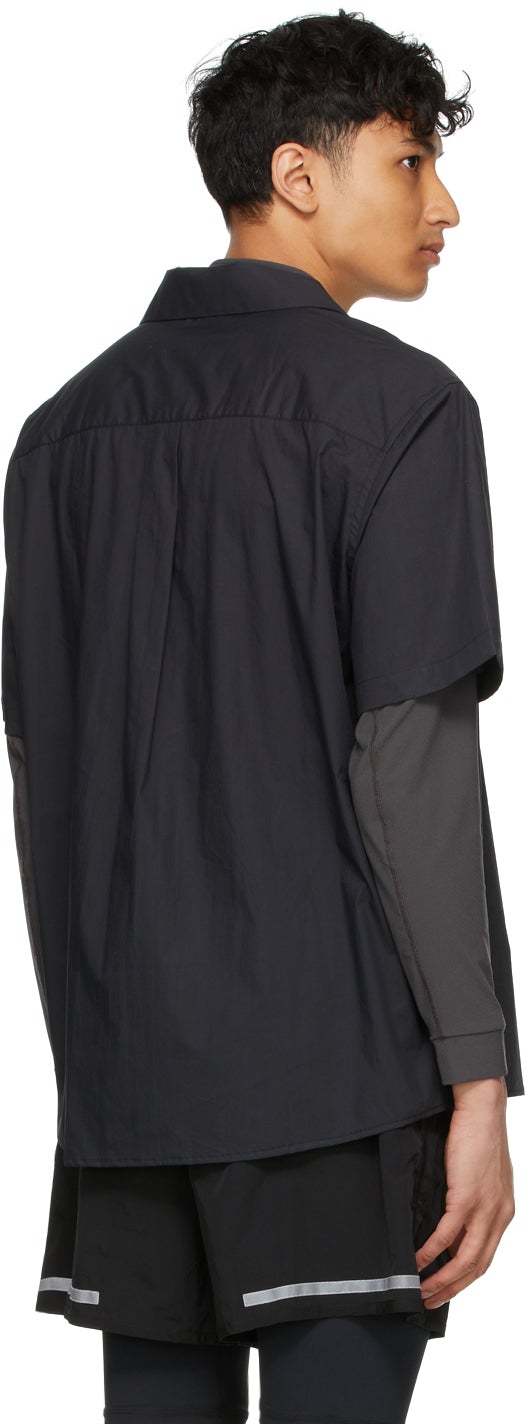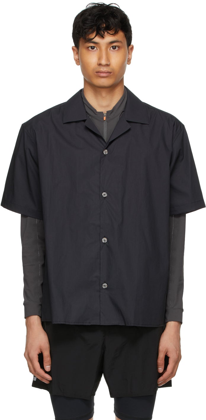 Short sleeve plain-woven viscose-blend shirt in black. Open spread collar. Button closure at front. Supplier color: Black 63% polyester, 37% viscose. Brand: True Tribe