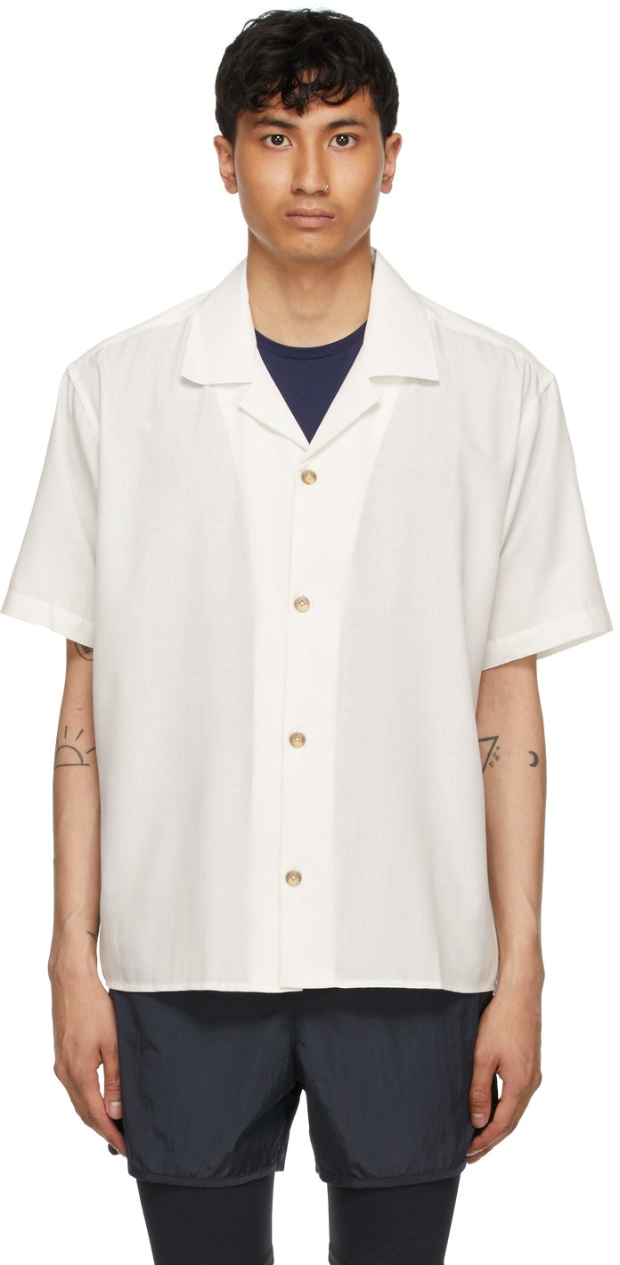 Short sleeve plain-woven viscose-blend shirt in white. Open spread collar. Button closure at front. Supplier color: Ivory 63% polyester, 37% viscose. Brand: True Tribe