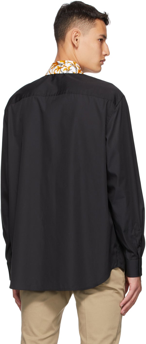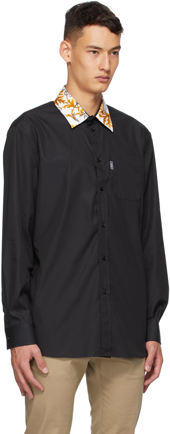 Long sleeve cotton poplin shirt in black. Spread collar featuring signature multicolor pattern. Button closure at front. Patch pocket featuring textile logo flag at chest. Single-button barrel cuffs. Shirttail hem. Tonal logo-engraved hardware. Supplier color: Black 100% cotton. Brand: Versace