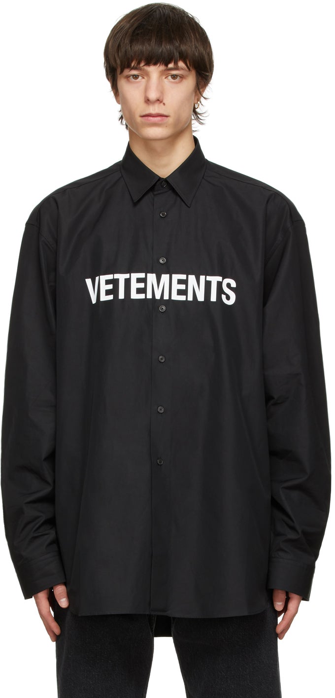 Long sleeve cotton poplin shirt in black. Spread collar. Button closure at front. Logo printed in white at chest. Single-button barrel cuffs. Shirttail hem. White hardware. Supplier color: Black 100% cotton. Brand: VETEMENTS