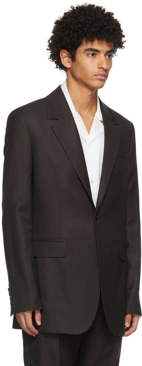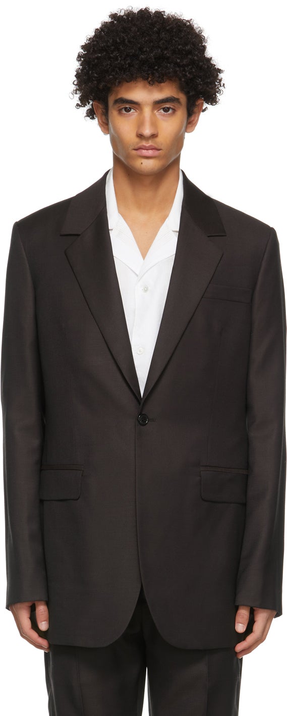 Long sleeve wool-blend canvas blazer in burgundy. Notched lapel collar. Single-button closure at front. Welt pocket at chest. Darts and flap pockets at waist. Padded shoulders. Four-button surgeon's cuffs. Central vent at back hem. Welt pockets at interior. Viscose satin lining in black. Fully lined. Black hardware. Supplier color: Aubergine purple Body: 60% wool, 40% polyester. Lining: 100% viscose. Brand: Acne Studios