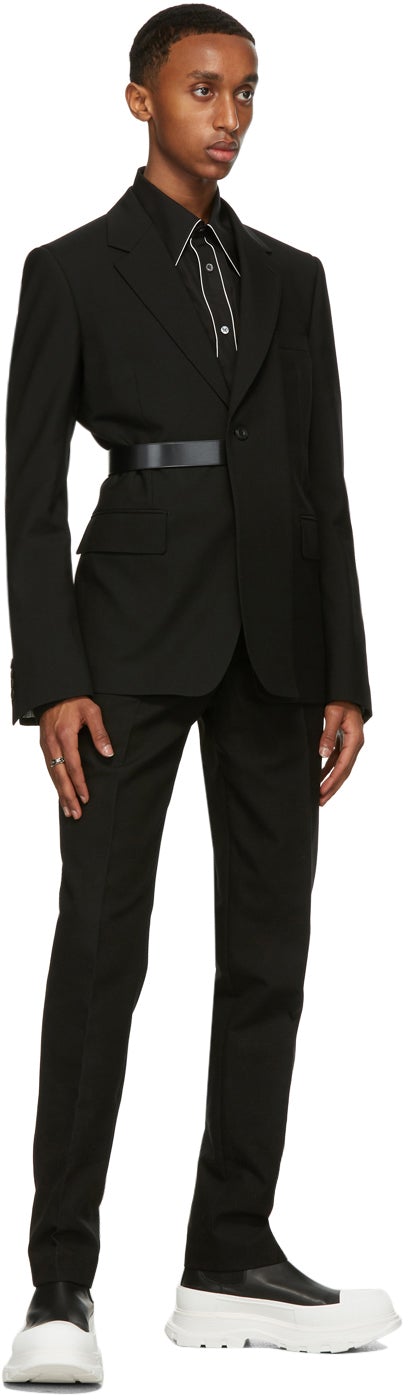Long sleeve wool twill blazer in black. Notched lapel collar. Button closure at front. Layered construction at front. Welt pocket at chest. Flap pockets at waist. Four-button surgeon's cuffs. Central vent at back hem. Welt pockets and belt loops at interior. Tonal cupro lining. Fully lined. Tonal hardware. Supplier color: Black Body: 100% wool. Lining 1: 100% cupro. Lining 2: 100% viscose. Lining 3: 100% cotton. Brand: Alexander McQueen