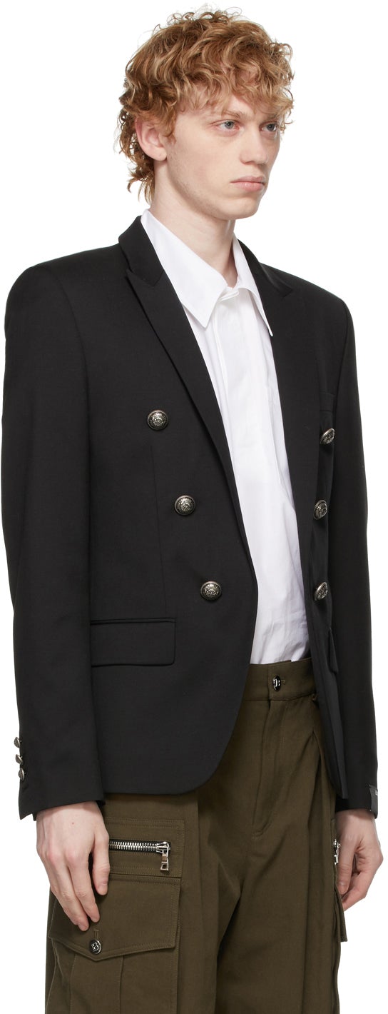 Long sleeve wool gabardine blazer in black. Peaked lapel collar. Double-breasted button closure at front. Welt pocket at chest. Flap pockets and darts at waist. Padded shoulders. Three-button surgeon's cuffs. Textile logo patch at cuff. Central vent at back hem. Welt pockets at interior. Tonal viscose satin lining. Fully lined. Logo-engraved antiqued silver-tone hardware. Supplier color: Black Body: 100% wool. Trim 1: 65% acetate, 35% viscose. Trim 2: 100% cotton. Lining: 65% acetate, 35% viscose. Brand: Balmain