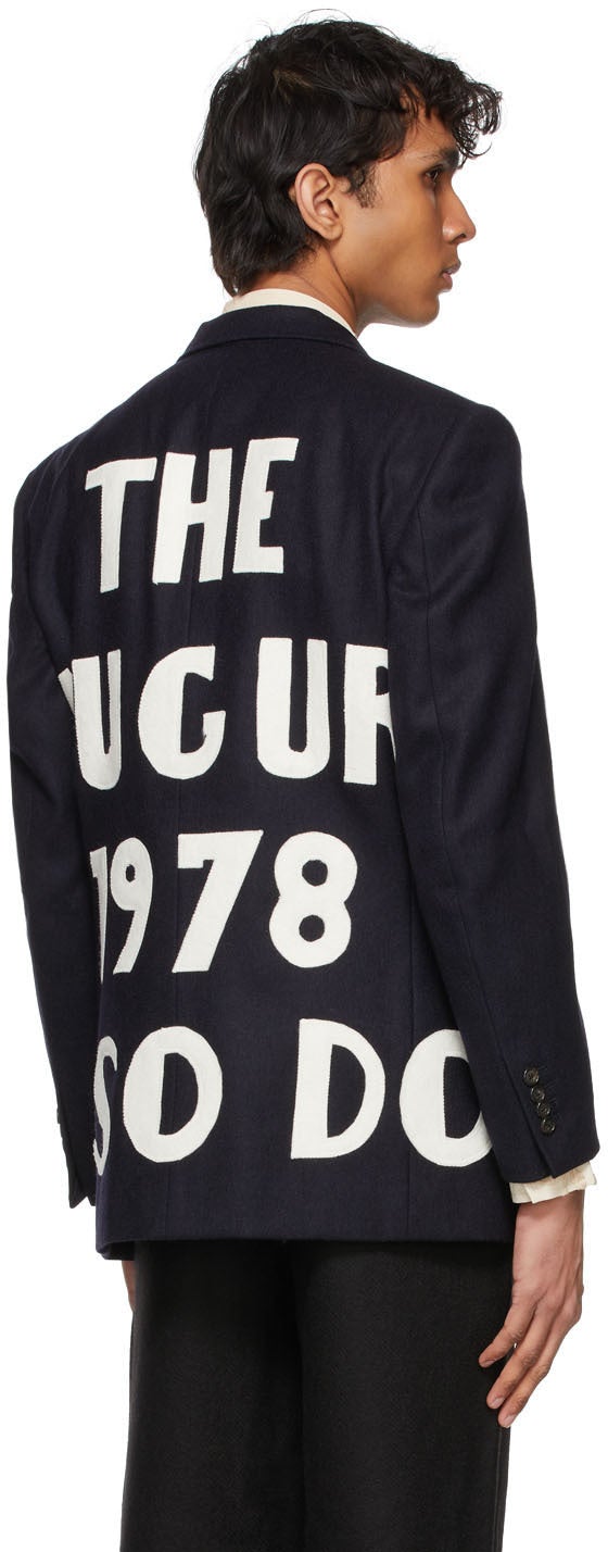 Long sleeve brushed merino wool blazer in blue. Graphic wool patches in white throughout. Notched lapel collar. Three-button closure at front. Welt pocket at chest. Flap pockets at waist. Padded shoulders. Four-button surgeon's cuffs. Welt pockets at interior. Tonal satin lining. Fully lined. Tortoiseshell hardware. Supplier color: Blue/White 100% merino wool. Brand: Bode