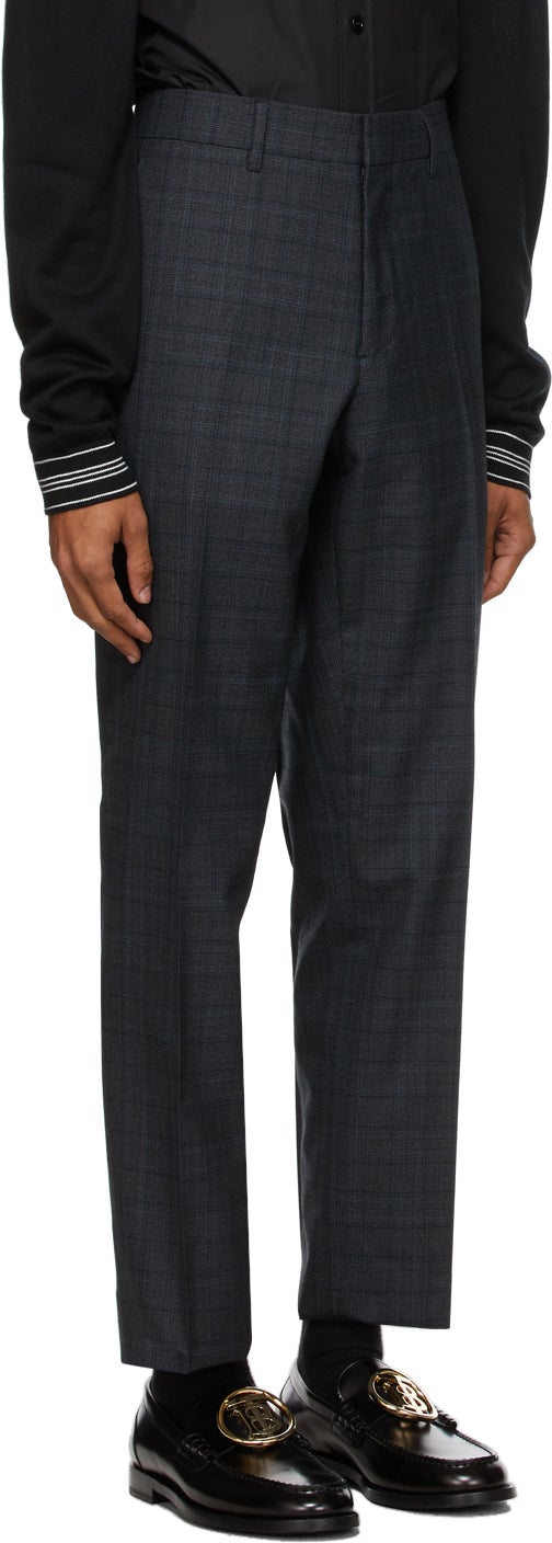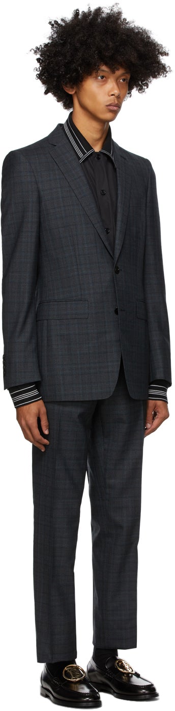 Long sleeve plain-woven wool suit featuring check pattern in tones of black, grey, and blue. Notched lapel collar. Button closure at front. Welt pocket at chest. Flap pockets at waist. Padded shoulders. Four-button surgeon's cuffs. Twin vents at back hem. Logo-patterned satin lining in black. Slim-fit plain-woven wool trousers featuring check pattern in tones of black, grey, and blue. Mid-rise. Four-pocket styling. Belt loops at waistband. Central creases at front. Unfinished hem. Zip-fly. Partial satin lining. Supplier color: Blue Body: 100% wool. Trim: 52% linen, 30% wool, 18% viscose. Lining: 100% cupro. Brand: Burberry