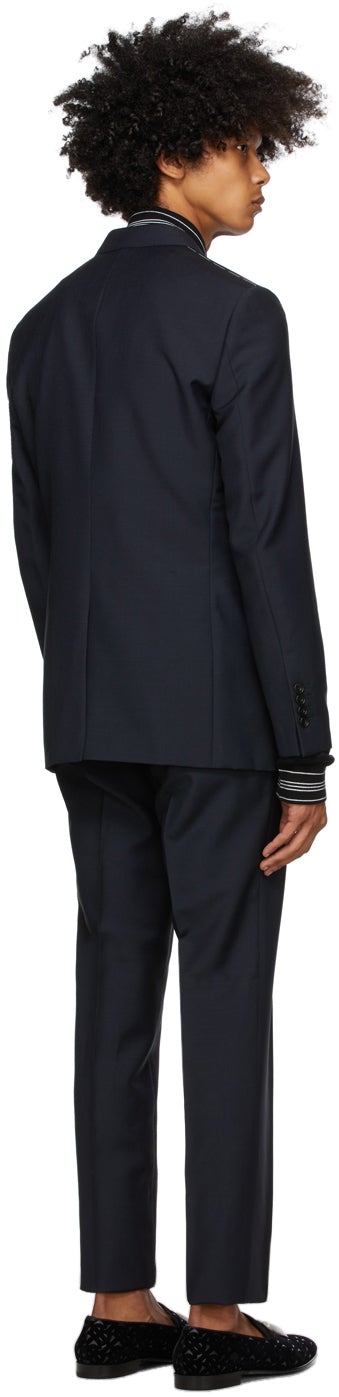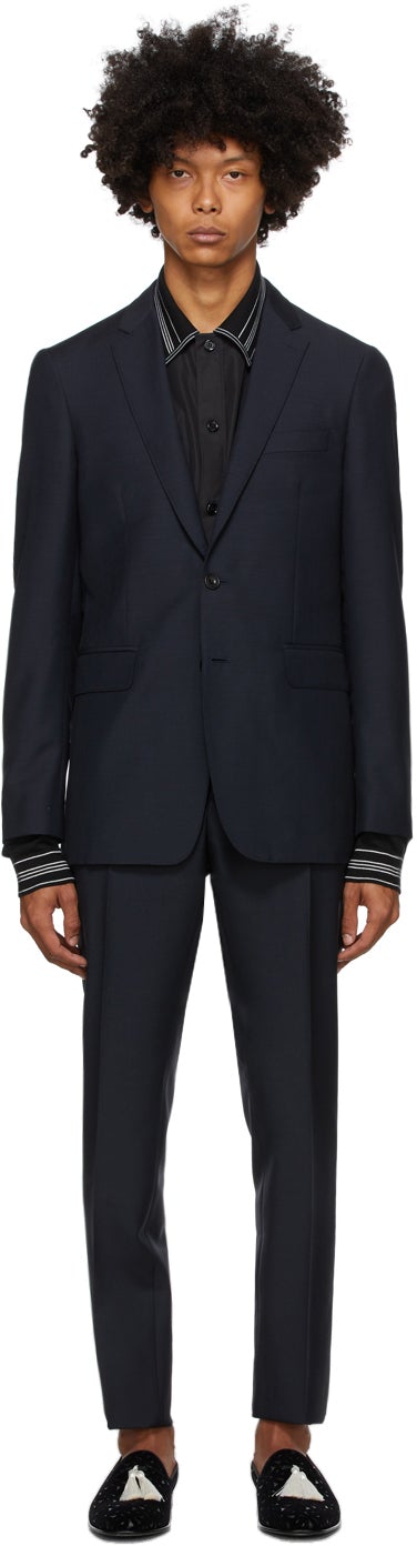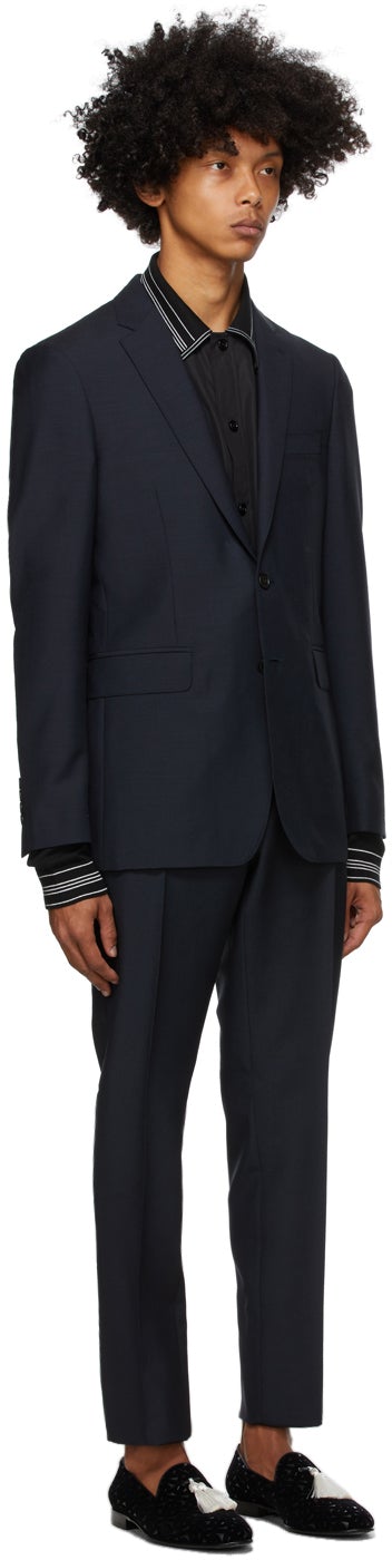 Long sleeve plain-woven wool and mohair-blend suit in blue. Notched lapel collar. Button closure at front. Welt pocket at chest. Flap pockets and darts at waist. Four-button surgeon's cuffs. Central vent at back hem. Logo-pattern satin lining in black. Slim-fit plain-woven wool and mohair-blend trousers in blue. Mid-rise. Four-pocket styling. Belt loops at waistband. Central creases at front. Unfinished hem. Zip-fly. Partial satin lining. Supplier color: Blue Body: 75% wool, 25% mohair. Lining 1: 100% cupro. Lining 2: 50% acetate, 50% cupro. Brand: Burberry