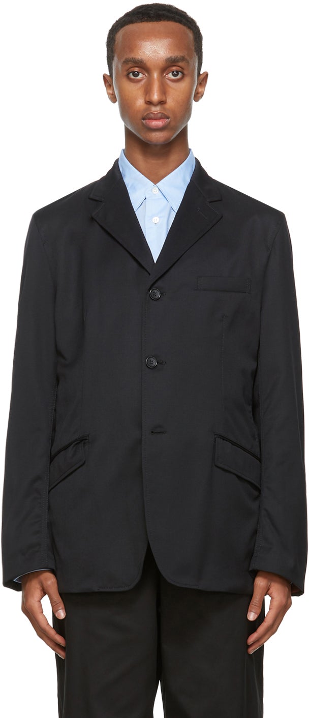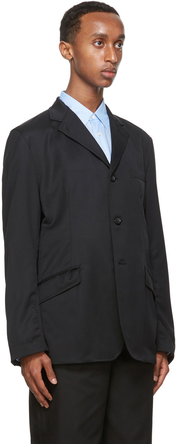 Long sleeve wool gabardine blazer in black. Notched lapel collar. Button closure at front. Welt pocket at chest. Flap pockets at waist. Three-button detailing at cuffs. Central vent at back hem. Welt pockets at interior. Cupro twill lining in red featuring jacquard knit logo pattern in black. Fully lined. Supplier color: Black Body: 100% wool. Lining: 100% cupro. Brand: Comme des Garçons Homme