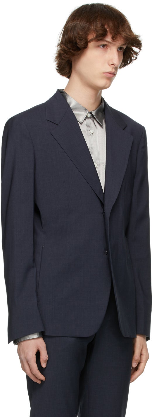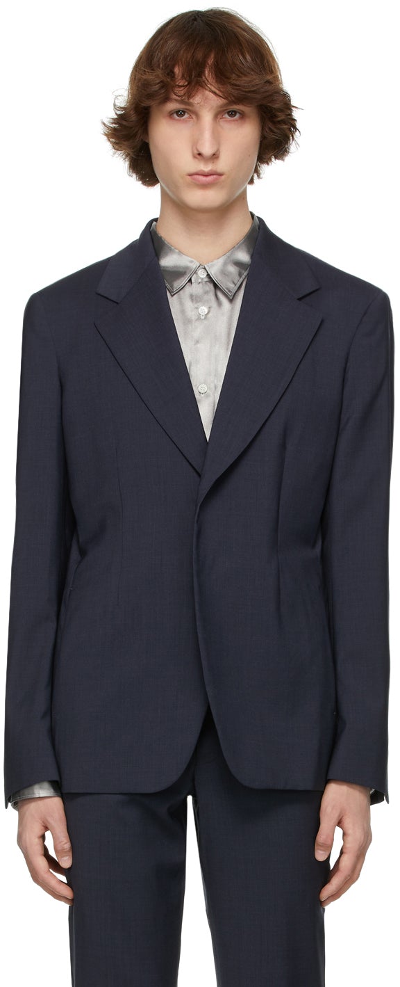 Long sleeve plain-woven wool blazer in grey. Notched lapel collar. Concealed hook-eye closure at front. Welt pocket at side-seams. Vented cuffs with concealed hook-eye fastening. Central vent at back hem. Cupro satin lining in black. Partially lined. Silver-tone hardware. Supplier color: Grey Body: 100% wool. Lining: 100% cupro. Brand: Comme des Garçons Homme Plus