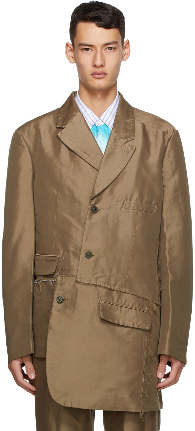 Panelled long sleeve twill blazer in khaki. Asymmetric construction with raw edges throughout. Notched lapel collar. Button closure at front. Welt pocket at chest. Darts at front. Flap pockets at waist. Three-button surgeon's cuffs. Central vent at back hem. Welt pockets at interior. Partially lined. Supplier color: Khaki 100% polyester. Brand: Comme des Garçons Homme Plus