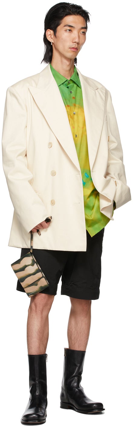 Long sleeve cotton twill blazer in beige. Peaked lapel collar. Double-breasted button closure at front. Welt pocket at chest. Flap pockets at waist. Welt pockets at interior. Tonal cotton twill lining. Fully lined. Tonal hardware. Supplier color: Ecru 100% cotton. Brand: Dries Van Noten