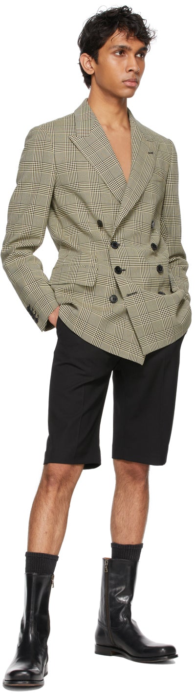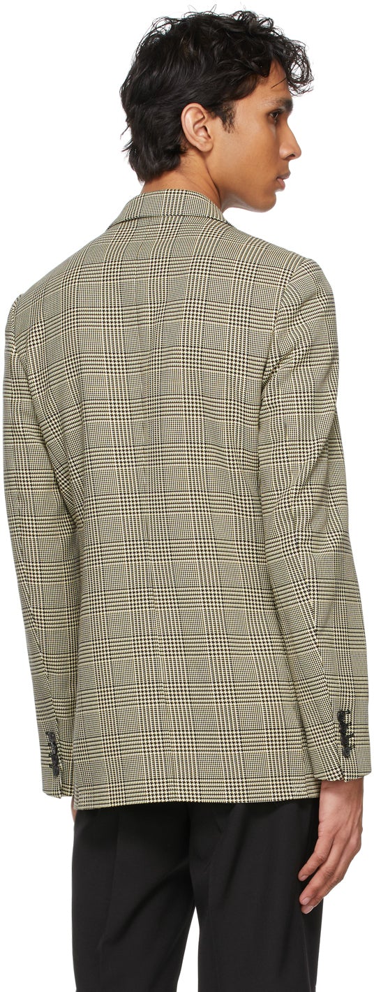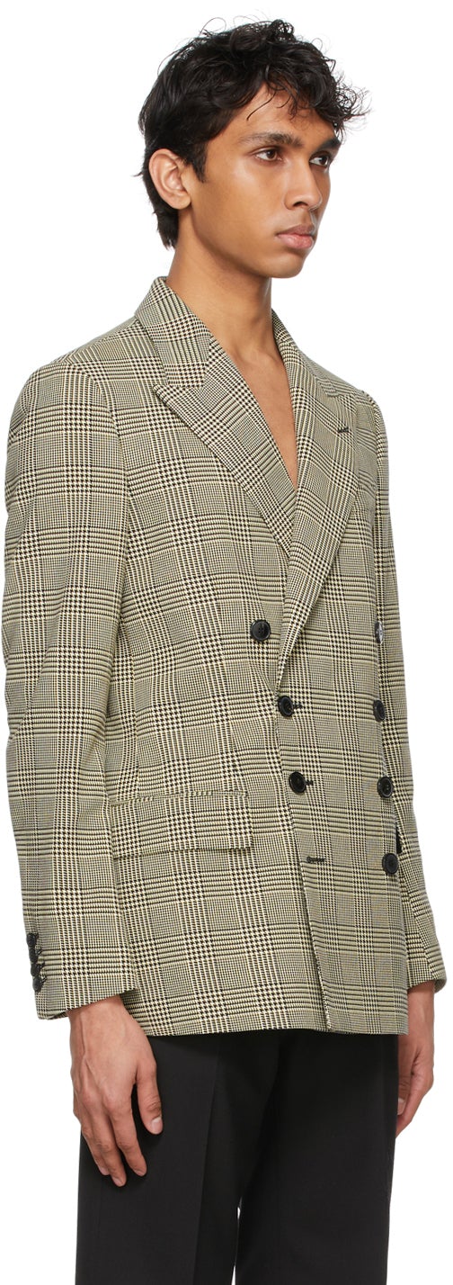 Long sleeve cotton twill blazer featuring check pattern in black and yellow. Peaked lapel collar. Double-breasted button closure at front. Welt pocket at chest. Flap pockets at waist. Padded shoulders. Four-button barrel cuffs. Twin vents at back hem. Full cupro satin lining in black. Black hardware. Supplier color: Black Body: 100% cotton. Lining: 100% cupro. Brand: Dries Van Noten