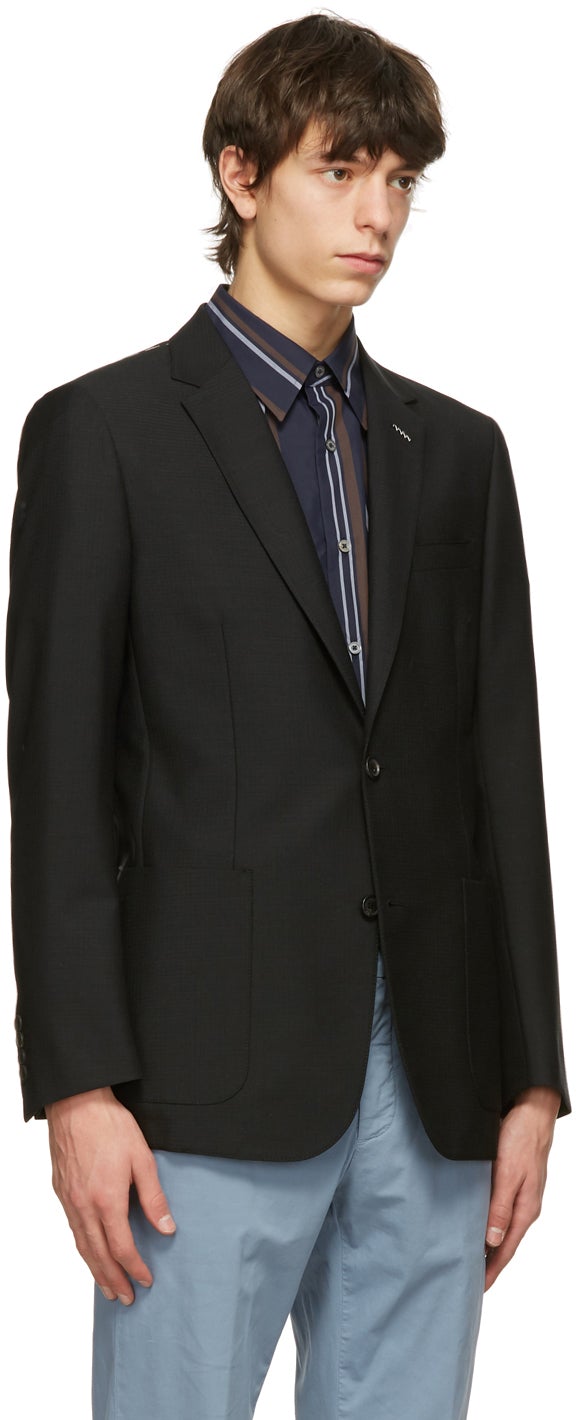 Long sleeve wool and mohair-blend blazer in black. Notched lapel collar. Two-button closure at front. Welt pocket at chest. Patch pockets at waist. Overlock stitching in white at shoulders. Four-button surgeon's cuffs. Twin vents at back hem. Welt pockets at interior. Tonal logo-engraved hardware. Supplier color: Black 70% wool, 30% mohair. Brand: Dunhill