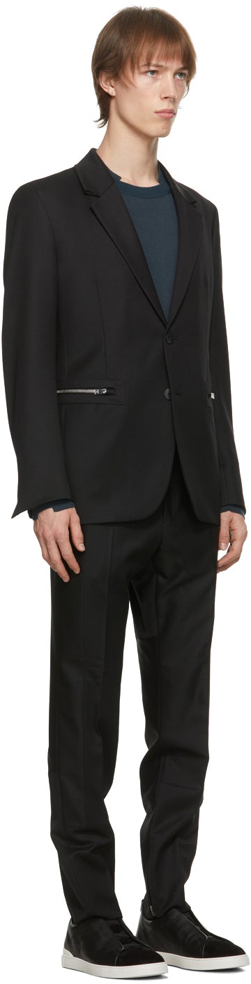 Long sleeve plain-woven Achillfarmâ„¢ merino wool blazer in black. Notched lapel collar. Button closure featuring signature stitching in tan at front. Darts at front. Zippered pockets at waist. Padded shoulders. Concealed single-button surgeon's cuffs. Central vent at back hem. Welt pockets at interior. Full cotton and cupro-blend satin lining. Tonal and silver-tone hardware. Skinny-fit woven Achillfarmâ„¢ merino wool trousers in black. Mid-rise. Four-pocket styling. Belt loops at waistband. Central creases and darts at front and back. Zippered vent at cuffs. Zip-fly. Full satin lining. Silver-tone hardware. Supplier color: Black Body 1: 100% merino wool. Body 2: 100% merino wool. Lining 1: 50% cotton, 50% cupro. Lining 2: 100% viscose. Brand: Ermenegildo Zegna Couture