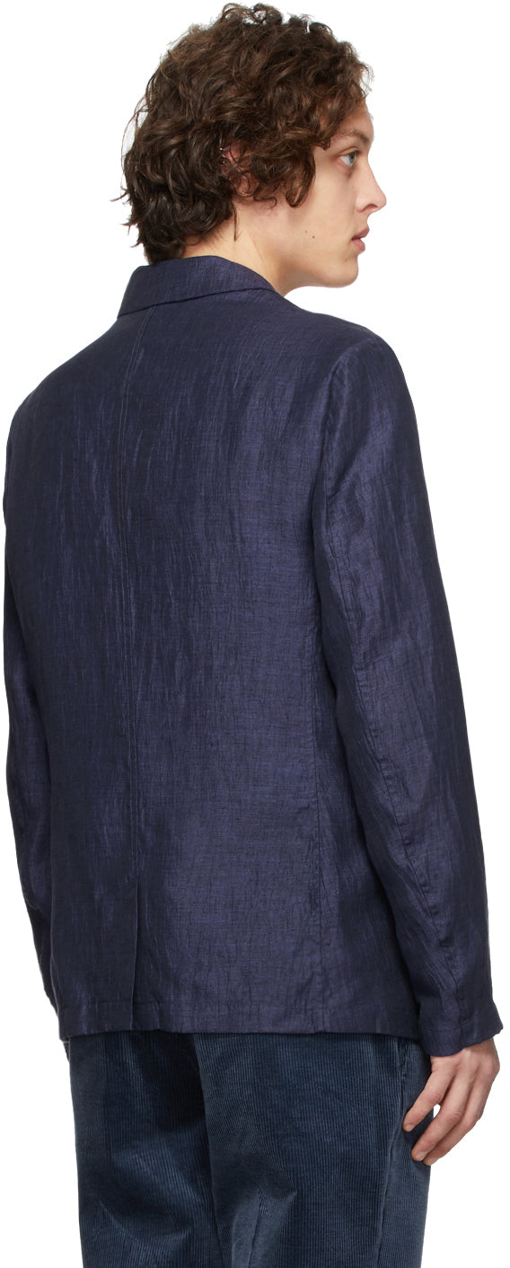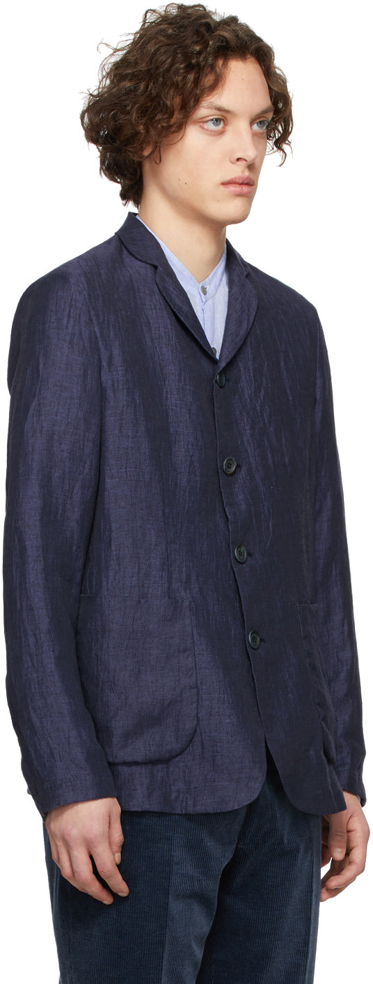 Long sleeve linen and nylon-blend shantung blazer in navy. Notched lapel collar. Four-button closure at front. Patch pockets at waist. Vented back hem. Patch pocket at interior. Unlined. Supplier color: Evening blue 88% linen, 12% polyamide. Brand: Giorgio Armani