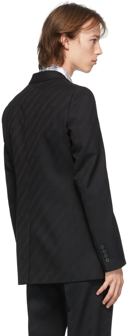 Long sleeve virgin wool blazer in black. Tonal jacquard logo woven throughout. Peaked lapel collar. Button closure at front. Welt pocket at chest. Flap pockets at waist. Four-button surgeon's cuffs. Central vent at hem. Welt pockets at interior. Full viscose and cupro lining. Supplier color: Black Body: 100% virgin wool. Lining: 51% cupro, 49% viscose. Brand: Givenchy