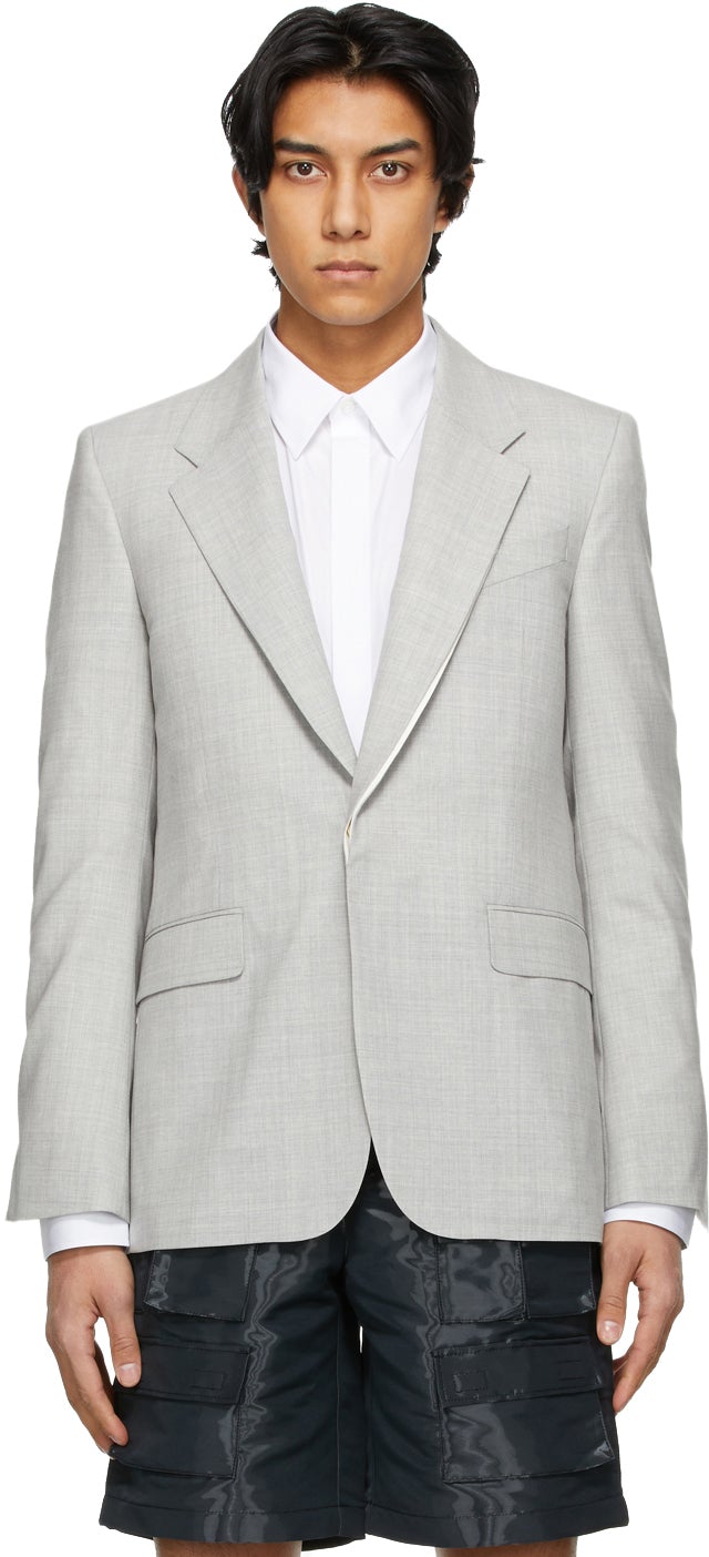 Long sleeve woven wool blazer in grey mélange. Notched lapel collar. Concealed button closure at front. Welt pocket at chest. Flap pockets at waist. Button fastening at vented cuffs. Lightly padded shoulders. Central vent at back hem. Satin twill lining in white. Supplier color: Light grey Body 1: 100% wool. Body 2: 100% cotton. Lining: 51% cupro, 49% viscose. Brand: Givenchy