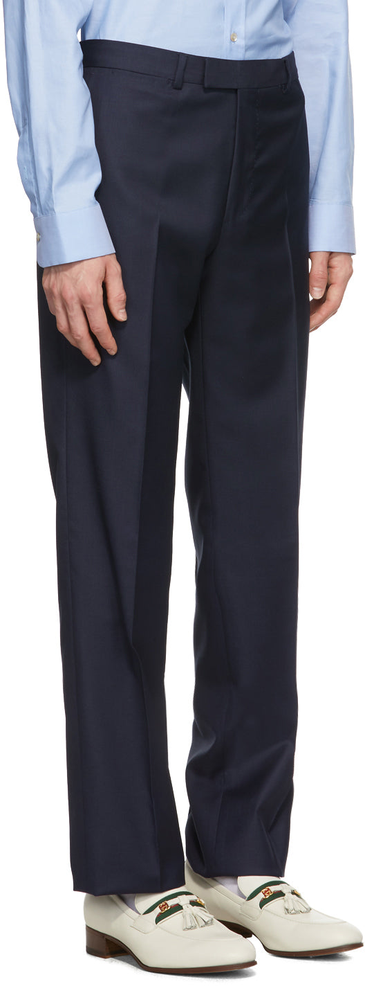 Long sleeve stretch wool twill blazer in navy. Notched lapel collar. Button closure at front. Welt pocket at chest. Flap pockets at waist. Padded shoulders. Twin vents at back hem. Five-button surgeon's cuffs. Logo patch and welt pockets at interior. Full cupro lining. Straight-leg stretch wool twill trousers in navy. Mid-rise. Four-pocket styling. Belt loops at waistband. Zip-fly. Tonal hardware. Partially lined. Supplier color: Caspian Body: 97% wool, 2% polyamide, 1% elastane. Lining 1: 100% cupro. Lining 2: 100% viscose. Brand: Gucci