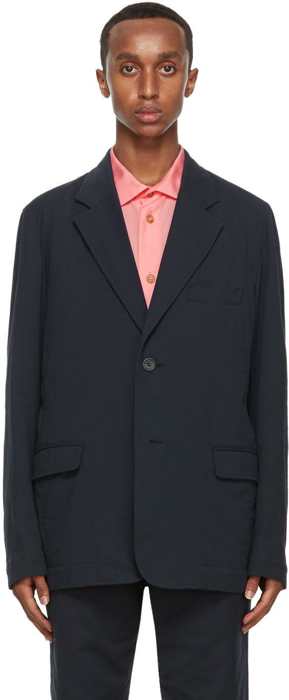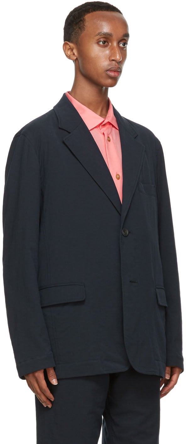 Long sleeve plain-woven cotton blazer in navy. Notched lapel collar. Button closure at front. Welt pocket at chest. Flap pockets at waist. Welt pockets and textile logo patch at interior. Unlined. Black hardware. Supplier color: Navy 100% cotton. Brand: Issey Miyake Men