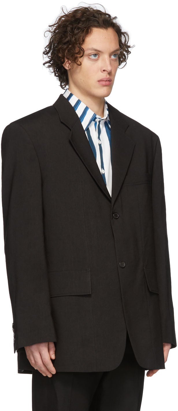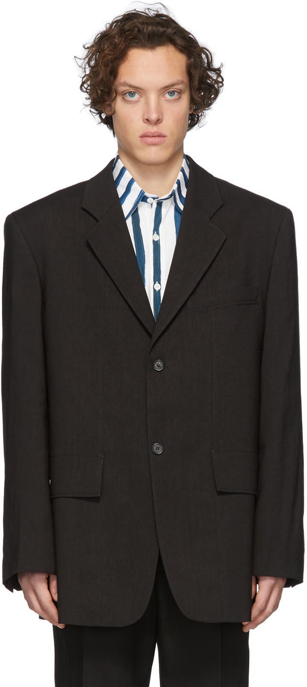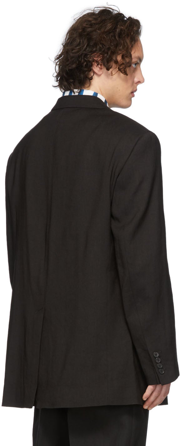 Long sleeve basket-woven hemp and virgin wool-blend blazer in black. Notched lapel collar. Button closure at front. Welt pocket at chest. Flap pockets at waist. Padded shoulders. Four-button barrel cuffs. Central vent at back hem. Welt pockets at interior. Fully lined. Supplier color: Black Body: 56% hemp, 36% virgin wool, 12% polyamide. Lining 1: 100% viscose. Lining 2: 65% polyester, 35% cotton. Brand: Jacquemus
