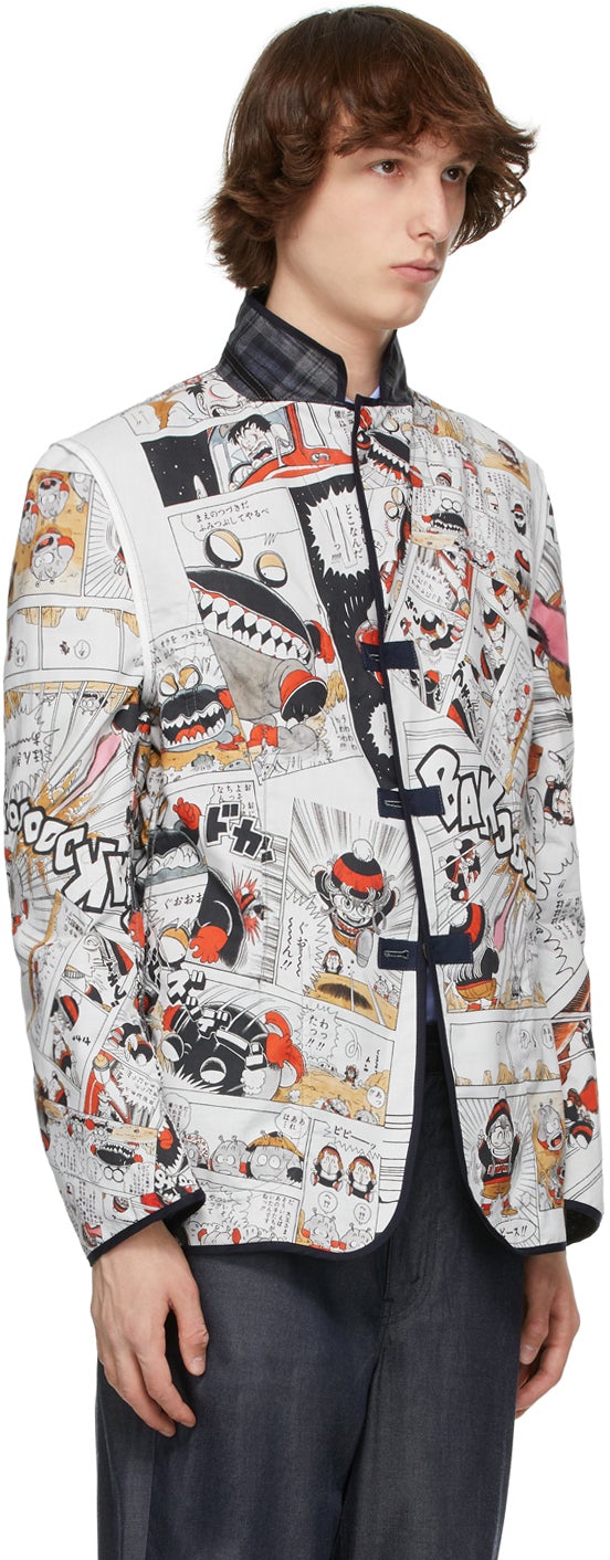 Long sleeve unstructured plain-woven linen blazer featuring check pattern woven in navy, grey, and black. Tonal piping throughout. Notched lapel collar. Patch pockets at chest and waist. Mock surgeon's cuffs. Central vent at back hem. Cotton lawn lining in white featuring multicolor printed graphic pattern. Fully lined. Mother-of-pearl hardware. Part of the Junya Watanabe x Akira Toriyama collaboration. Supplier color: Navy Body: 100% linen. Trim: 100% cotton. Lining: 100% cotton. Brand: Junya Watanabe