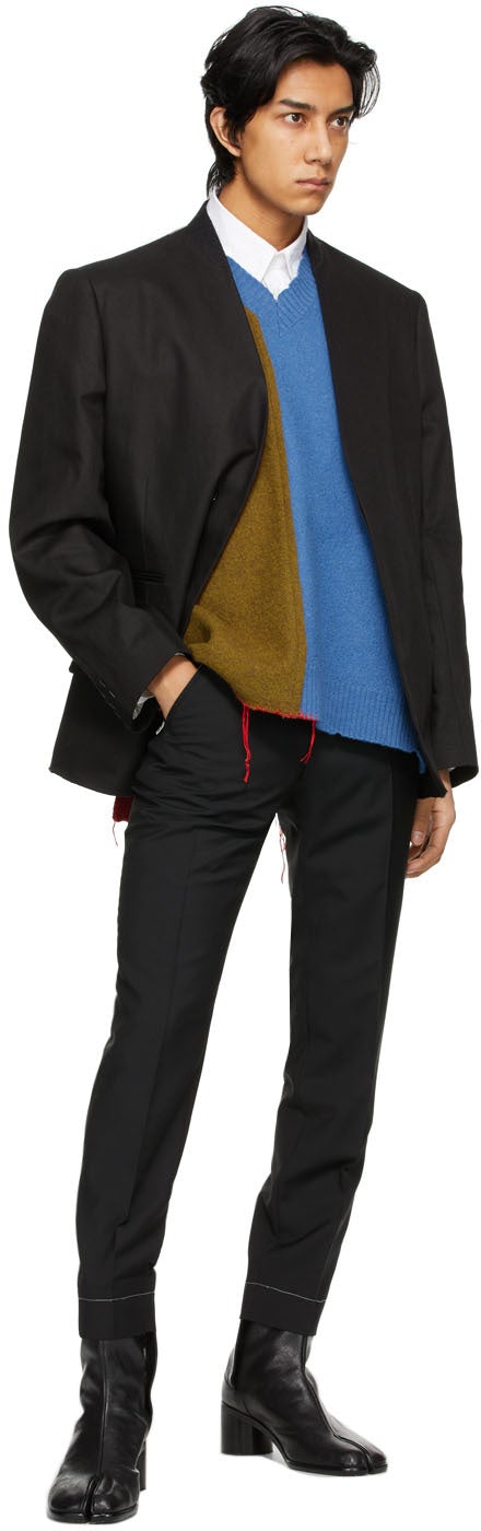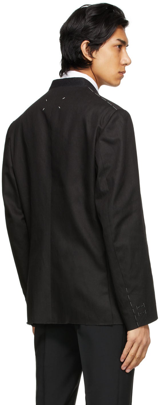Long sleeve cotton and linen-blend twill blazer in black. Shawl collar. Concealed offset button closure at front. Welt pocket and darts at front. Flap pockets at waist. Raw edge at hem. Topstitching in white at shoulders and cuffs. Signature white stitching at back collar. Welt pockets at interior. Partially lined. Tonal hardware. Supplier color: Black Body: 55% cotton, 45% linen. Lining 1: 100% viscose. Lining 2: 100% cotton. Lining 3: 55% viscose, 45% cupro. Brand: Maison Margiela
