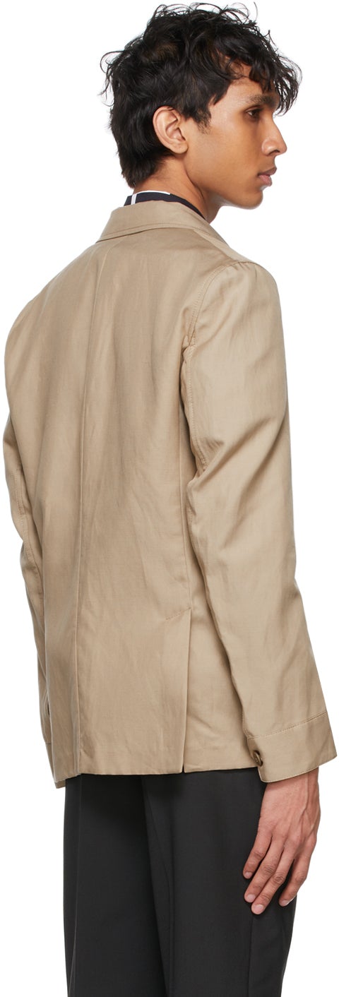 Long sleeve unstructured stretch linen-blend twill blazer in beige. Notched lapel collar. Two-button closure at front. Twin darts at front. Patch pockets at waist. Single-button barrel cuffs. Twin vents at back hem. Zippered pocket and patch pocket at interior. Partial cupro-blend satin lining. Logo-engraved tonal hardware. Supplier color: Safari Body: 59% lycra, 23% linen, 18% cotton. Lining: 53% cupro, 47% polybutylene. Brand: Neil Barrett