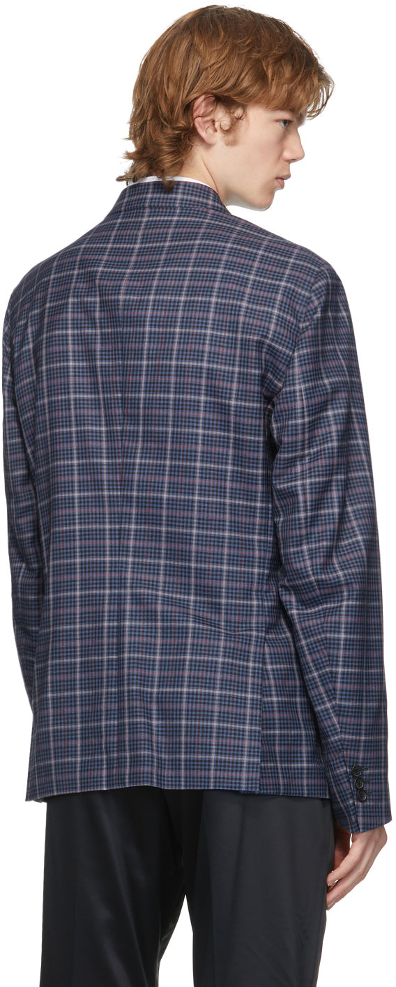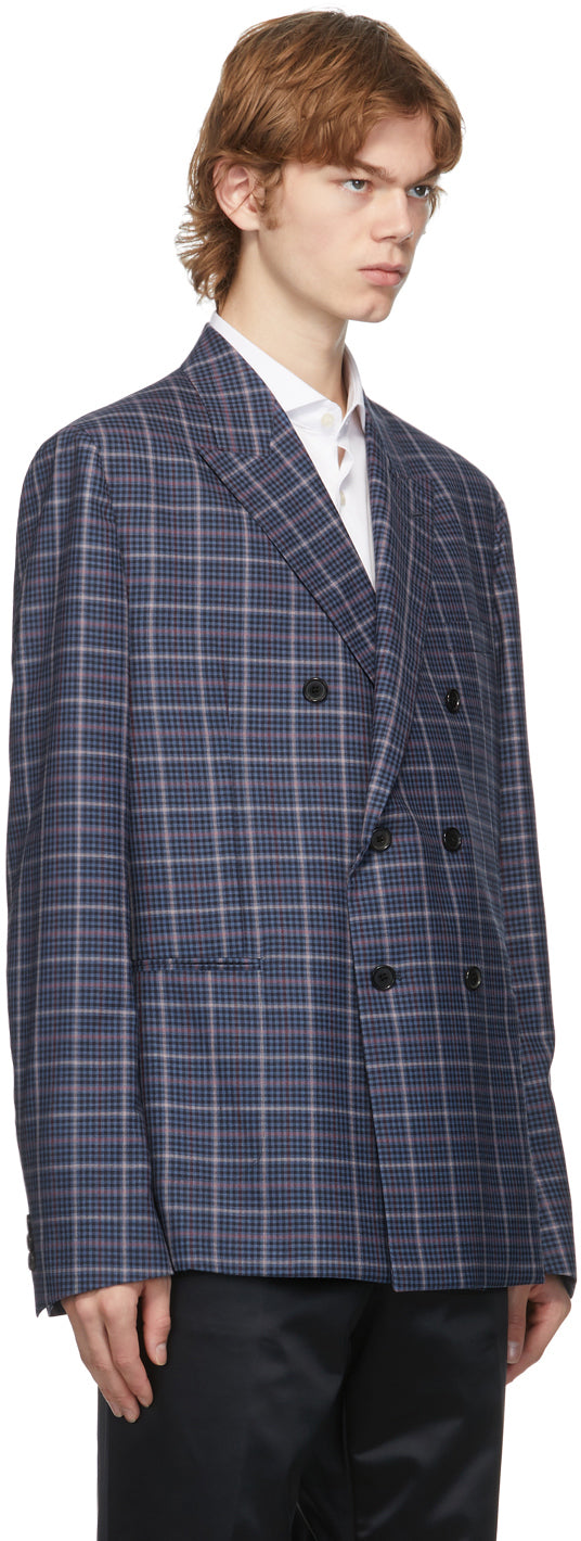 Long sleeve wool canvas blazer featuring check pattern in blue, black, and pink. Peaked lapel collar. Double-breasted button closure and darts at front. Welt pocket at chest. Patch pockets at waist. Three-button surgeon's cuffs. Welt pockets at interior. Partially lined. Twin vents at back hem. Supplier color: Navy 100% wool. Brand: Paul Smith
