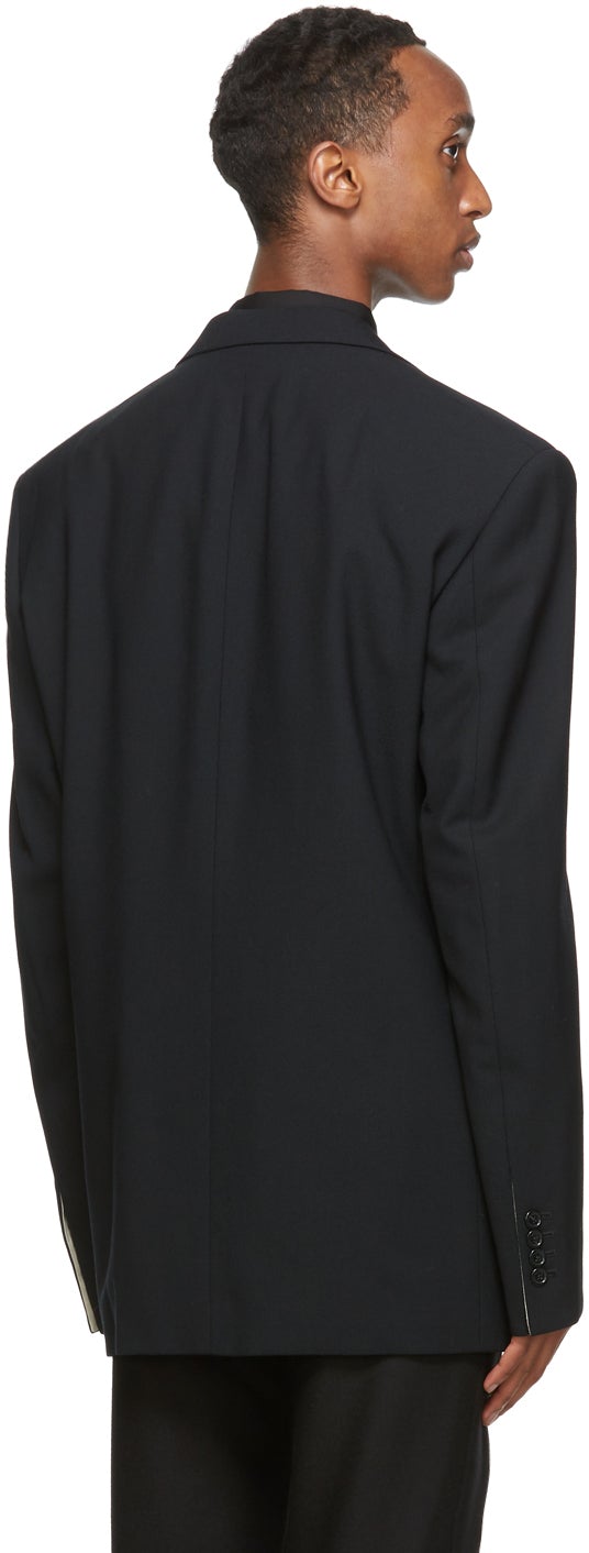 Long sleeve wool-blend twill blazer in black. Notched lapel collar. Button closure at front. Welt pocket at chest. Darts at front. Flap pockets at waist. Four-button surgeon's cuffs. Tonal textile logo patch at cuff. Welt pockets and textile logo at off-white cotton canvas interior. Fully lined. Supplier color: Black Body: 51% wool, 49% polyester. Lining: 100% cotton. Brand: Raf Simons