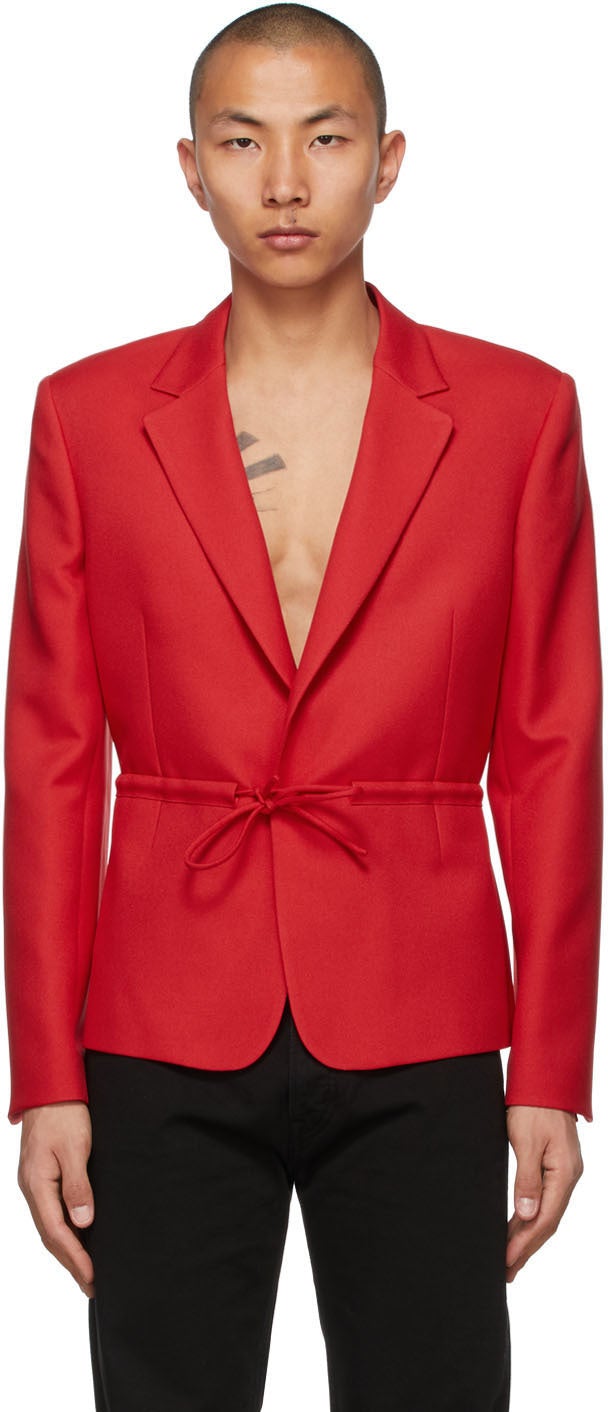 Long sleeve twill blazer in red. Notched lapel collar. Drawstring with self-tie fastening at front. Padded shoulders. Vented cuffs. Welt pockets at interior. Tonal satin lining. Silver-tone hardware. Supplier color: Red Body: 100% polyester. Lining 1: 100% viscose. Lining 2: 58% acetate, 42% cupro. Brand: Random Identities
