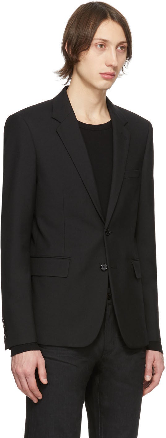 Long sleeve wool gabardine blazer in black. Notched lapel collar. Padded shoulders. Button closure at front. Welt pocket at chest. Darts and welt pockets at waist. Four-button surgeon's cuffs. Central vent at back hem. Welt pockets at interior. Tonal hardware. Satin lining in black. Supplier color: Black Body: 100% wool. Lining 1: 100% silk. Lining 2: 100% cotton. Brand: Saint Laurent