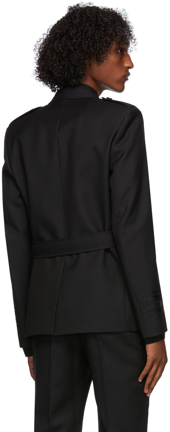 Long sleeve wool twill blazer in black. Peaked lapel collar. Button closure at front. Flap pockets at chest and waist. Darts, belt loops, and detachable belt with pin-buckle fastening at waist. Buttoned epaulets. Tonal embroidered detailing at cuffs. Central vent at back hem. Welt pockets at interior. Silk satin lining. Fully lined. Tonal hardware. Supplier color: Black Body: 100% wool. Lining: 100% silk. Brand: Saint Laurent