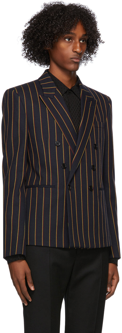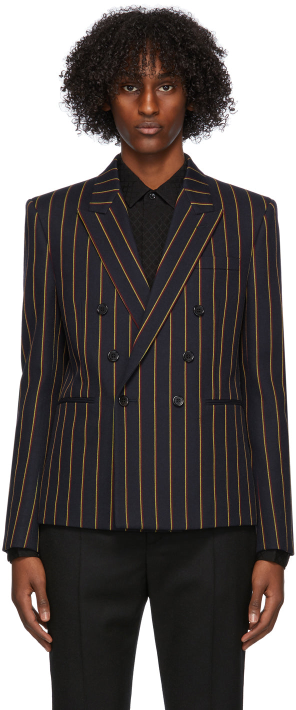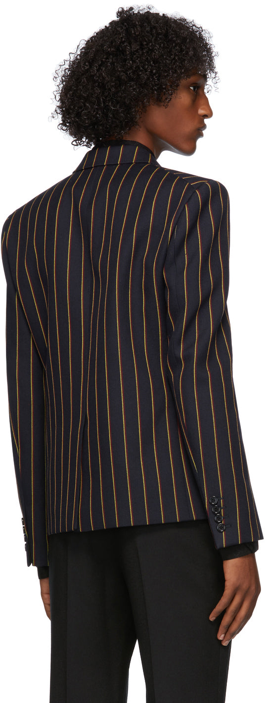 Long sleeve wool twill blazer in navy featuring striped pattern in yellow and red throughout. Peaked lapel collar. Double-breasted button closure at front. Welt pocket at chest. Darts and welt pockets at waist. Four-button surgeon's cuffs. Central vent at back hem. Welt pockets at interior. Silk satin lining. Fully lined. Horn hardware. Supplier color: Navy/Yellow Body: 100% wool. Lining: 100% silk. Brand: Saint Laurent