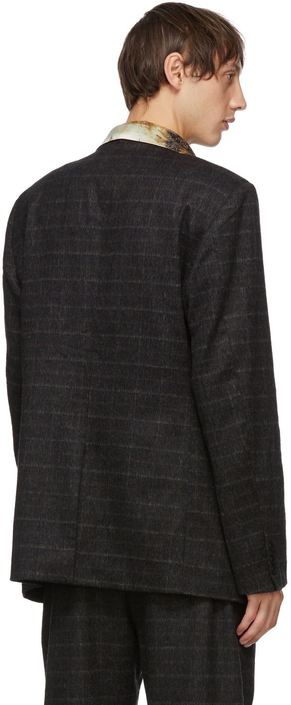 Long sleeve brushed wool-blend blazer in brown featuring tonal check pattern throughout. Notched lapel collar. Single-button closure at front. Welt pocket at chest. Flap pockets and darts at waist. Transparent rubberized logo patch at sleeve. Three-button surgeon's cuffs. Central vent at back hem. Welt pockets at interior. Fully lined. Black hardware. Supplier color: Brown grid Body: 75% wool, 25% polyester. Lining: 100% viscose. Brand: Serapis
