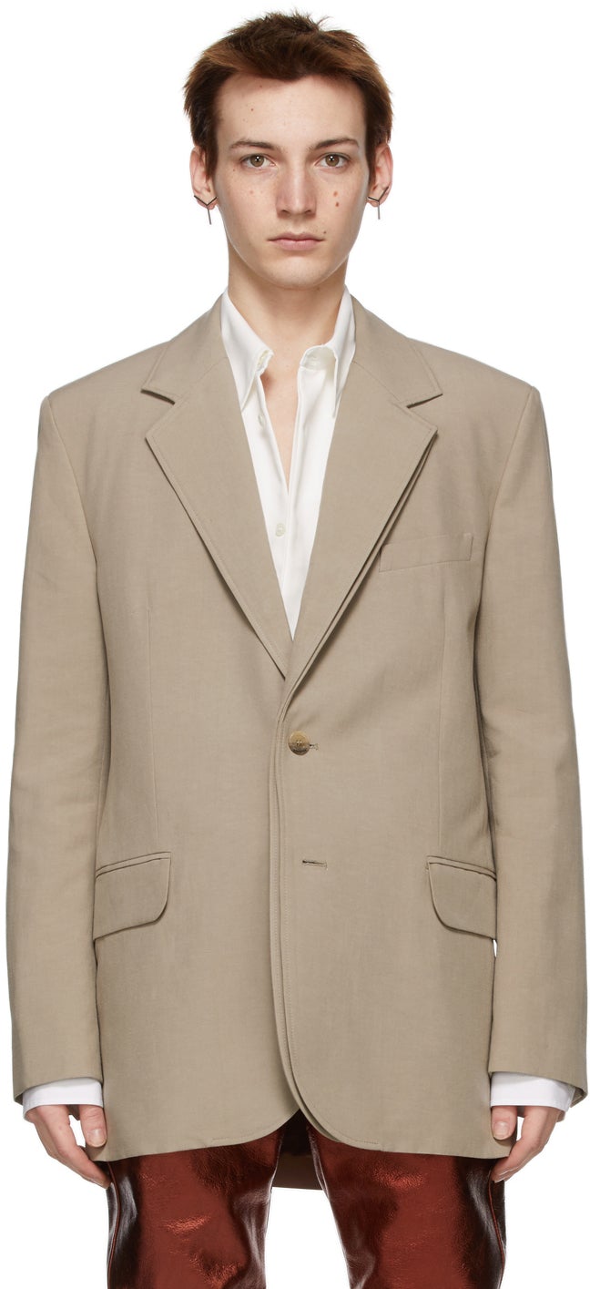 Long sleeve rayon and linen-blend blazer in taupe. Layered construction. Peaked lapel collar. Button closure at front. Welt pocket at chest. Darts, flap pockets, and concealed welt pockets at waist. Padded shoulders. Four-button surgeon's cuffs. Central vent at back hem. Welt pocket at interior. Viscose twill lining in brown. Fully lined. White hardware. Supplier color: Taupe Body: 60% rayon, 40% linen. Lining: 100% viscose. Brand: Y/Project