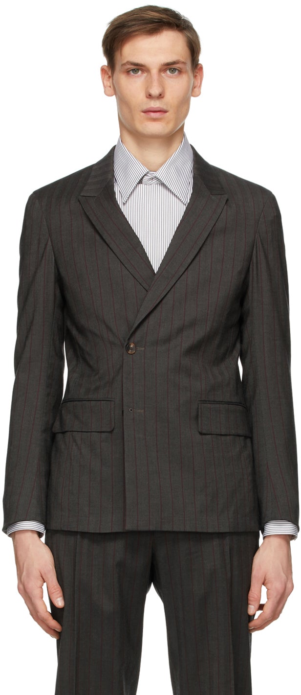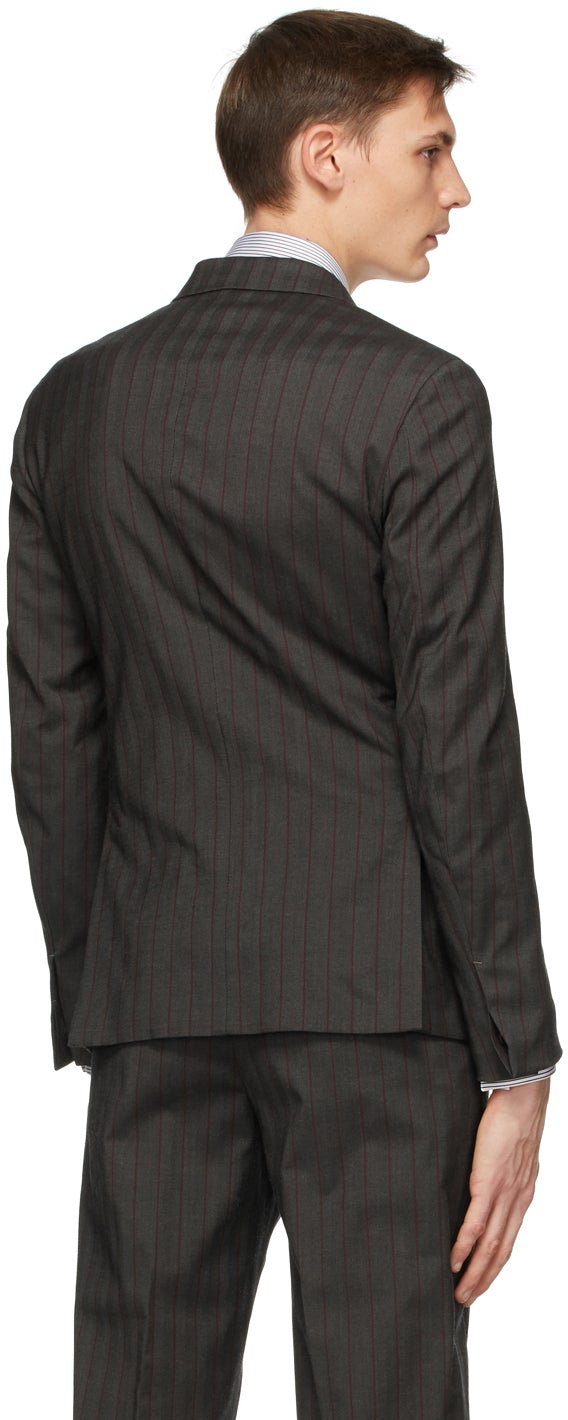 Long sleeve stretch wool and cotton-blend herringbone blazer in grey featuring stripes in red and blue. Peaked lapel collar. Double-breasted button closure at front. Flap pockets at waist. Concealed button-fastening at vented cuffs. Textile logo patch in black and white at cuff. Twin vents at back hem. Welt pockets at interior. Partial viscose satin lining. Brown hardware. Supplier color: Charcoal Body: 60% wool, 37% cotton, 3% elastane. Lining: 100% viscose. Brand: Z Zegna