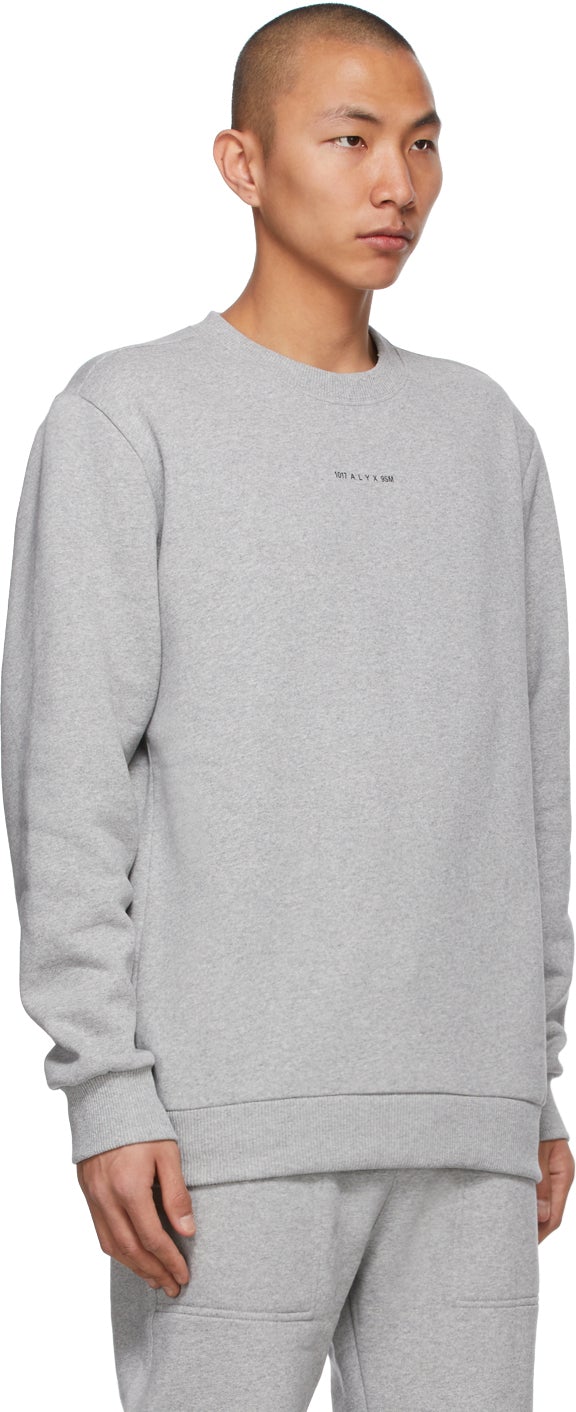 Long sleeve cotton-blend fleece sweatshirt in grey. Rib knit crewneck collar, cuffs, and hem. Logo printed in black at chest. Supplier color: Grey 50% cotton, 50% polyester. Brand: 1017 ALYX 9SM