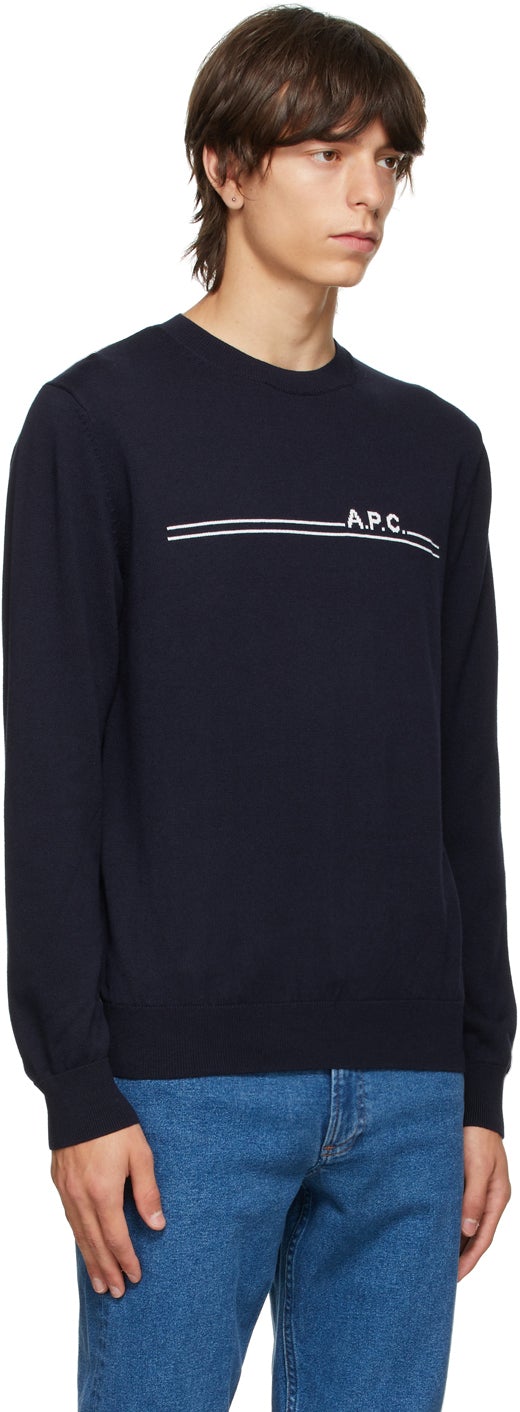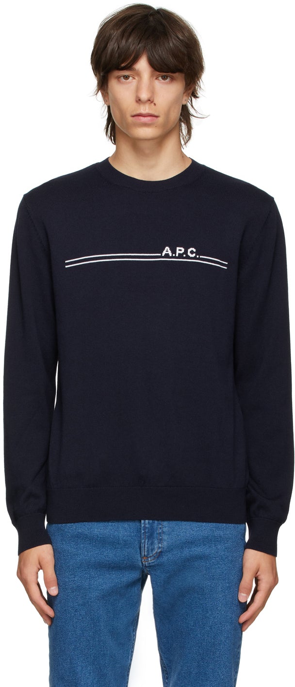 Long sleeve knit cotton and cashmere-blend sweater in navy. Rib knit crewneck collar, cuffs,and hem. Logo graphic embroidered in white at chest. Supplier color: Dark navy 90% cotton, 10% cashmere. Brand: A.P.C.