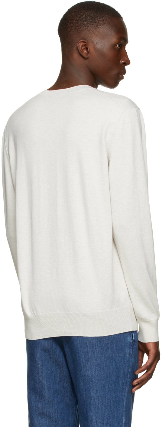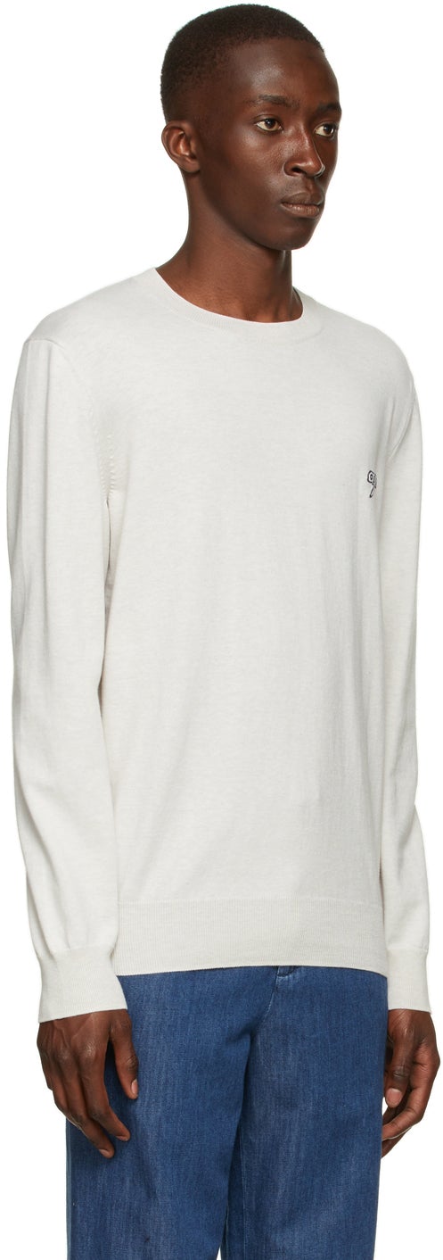 Long sleeve knit cotton sweater in off-white. Rib knit crewneck collar, cuffs, and hem. Logo embroidered in navy at chest. Supplier color: Chalk 100% cotton. Brand: A.P.C.