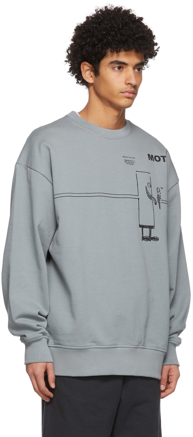 Long sleeve organic cotton French terry sweatshirt in grey. Rib knit crewneck collar, cuffs, and hem. Text and graphic printed in black at front. Logo printed in black at cuff. Part of the Acne Studios x Beni Bischof collaboration. Supplier color: Fog grey 100% organic cotton. Brand: Acne Studios