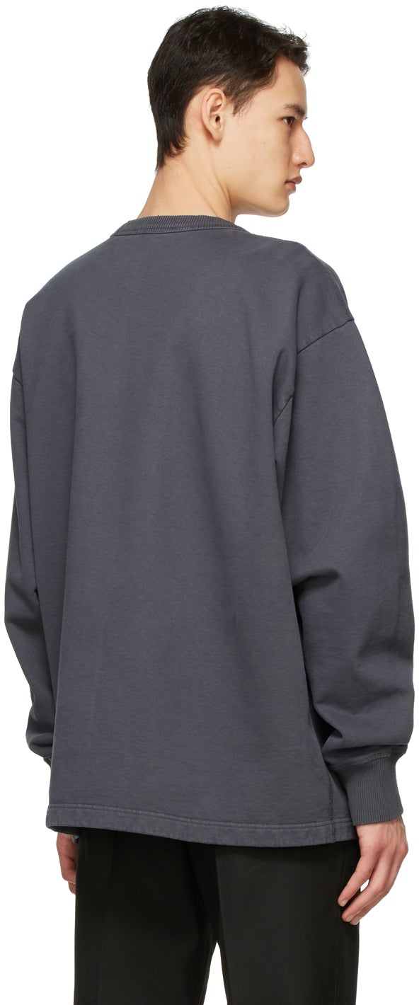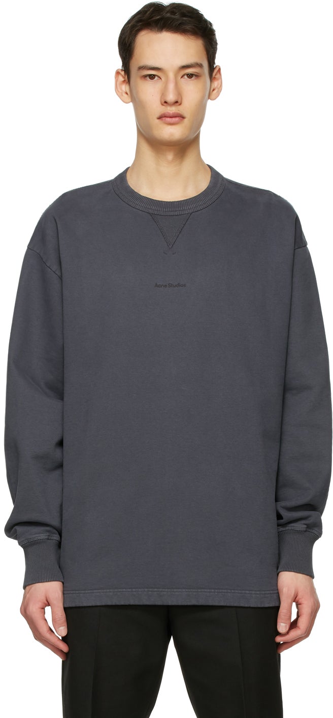 Long sleeve garment-dyed cotton fleece sweatshirt in dark grey. Rib knit crewneck collar and cuffs. Printed logo in black at chest. Supplier color: Slate grey 100% cotton. Brand: Acne Studios