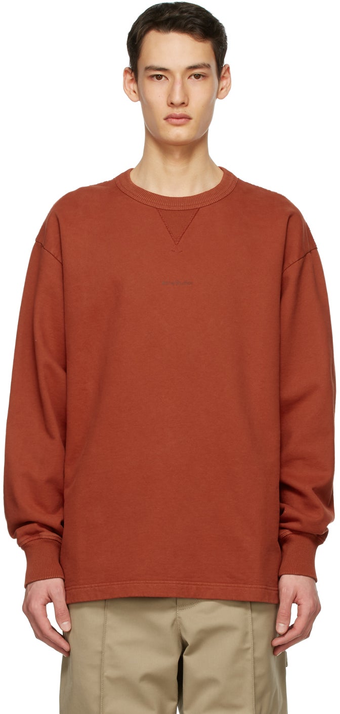 Long sleeve garment-dyed cotton fleece sweatshirt in orange. Rib knit crewneck collar and cuffs. Printed logo in brown at chest. Supplier color: Copper 100% cotton. Brand: Acne Studios