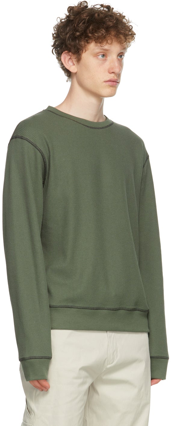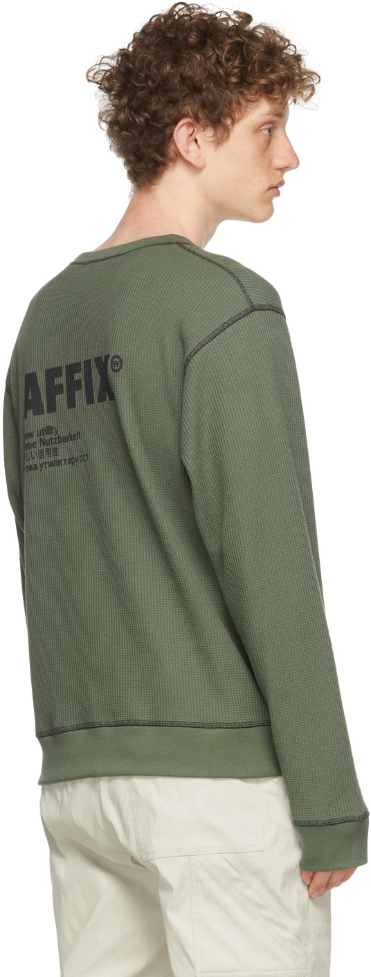 Long sleeve waffle knit cotton-blend sweatshirt in green. Rib knit crewneck collar, cuffs, and hem. Logo printed in black at back. Contrast stitching in black. Supplier color: Field green 50% cotton, 50% recycled polyester. Brand: Affix