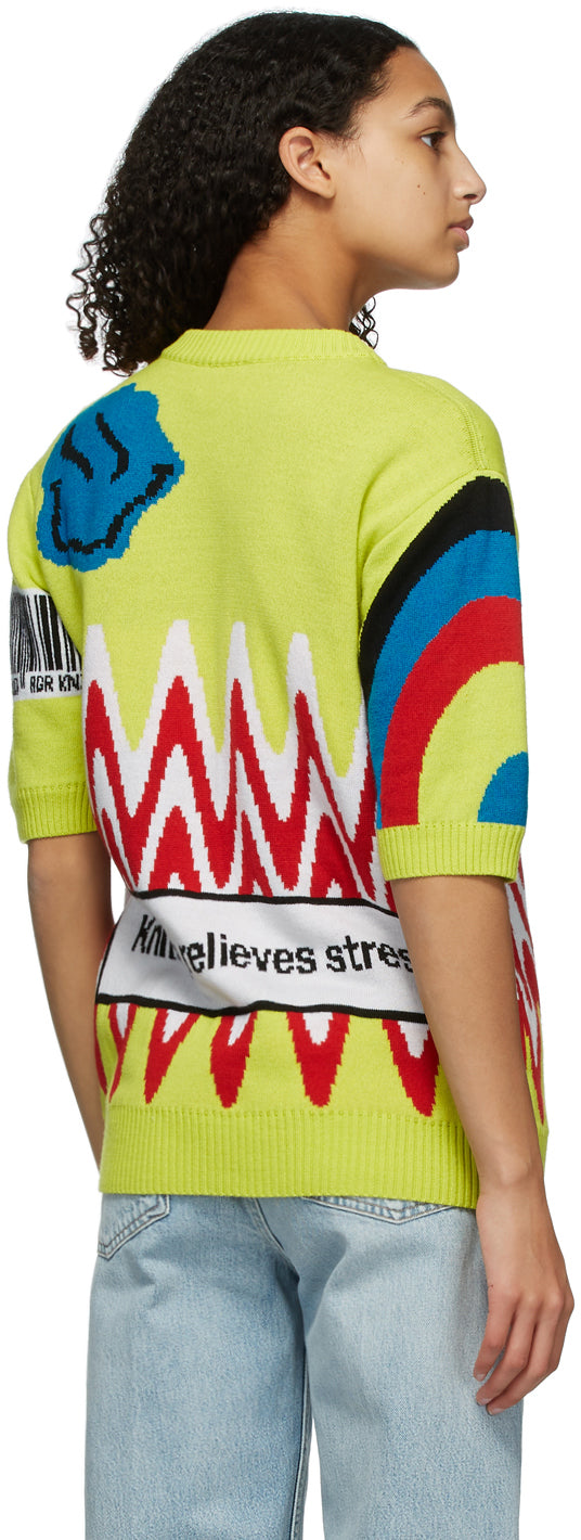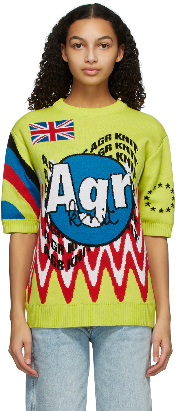 Short sleeve jacquard knit merino wool-blend sweater featuring graphic pattern in multicolor throughout. Rib knit crewneck collar, cuffs, and hem. Available exclusively at SSENSE. Supplier color: Yellow 50% merino wool, 50% acrylic. Brand: AGR
