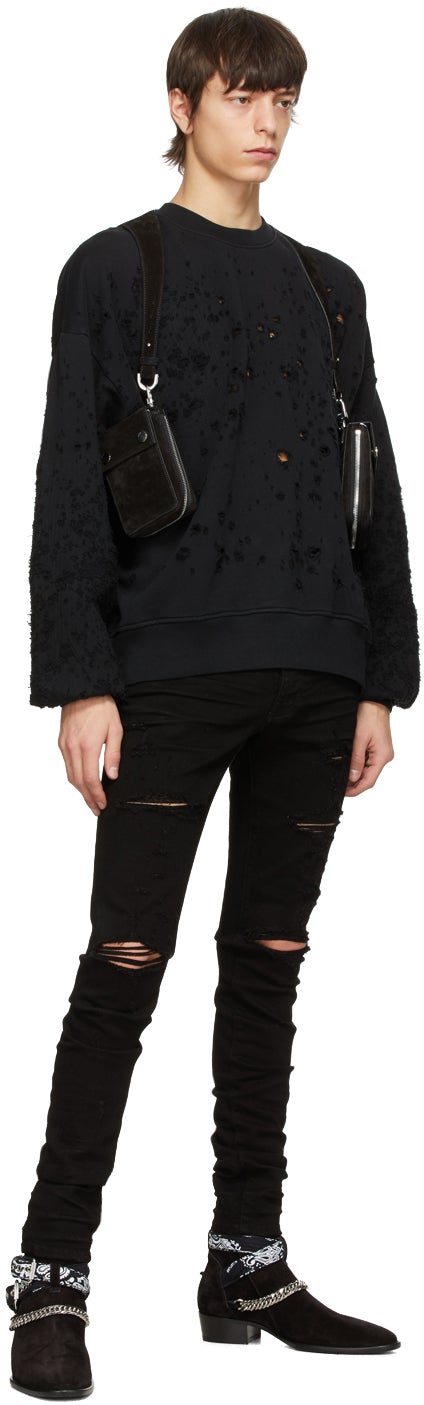 Long sleeve French terry sweatshirt in black. Distressing and tonal embroidery throughout. Rib knit crewneck collar, cuffs, and hem. Supplier color: Black 100% cotton. Brand: AMIRI