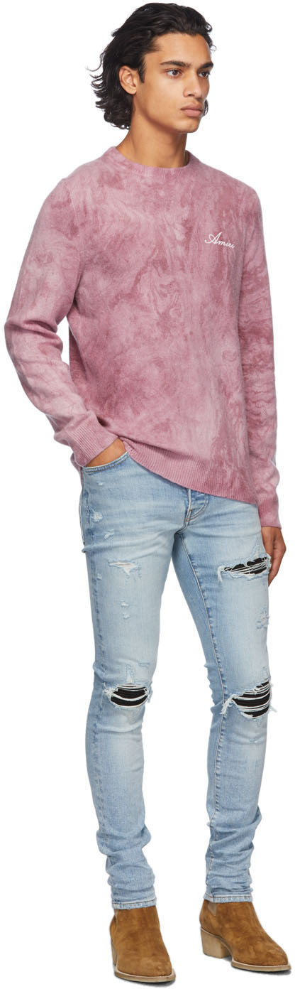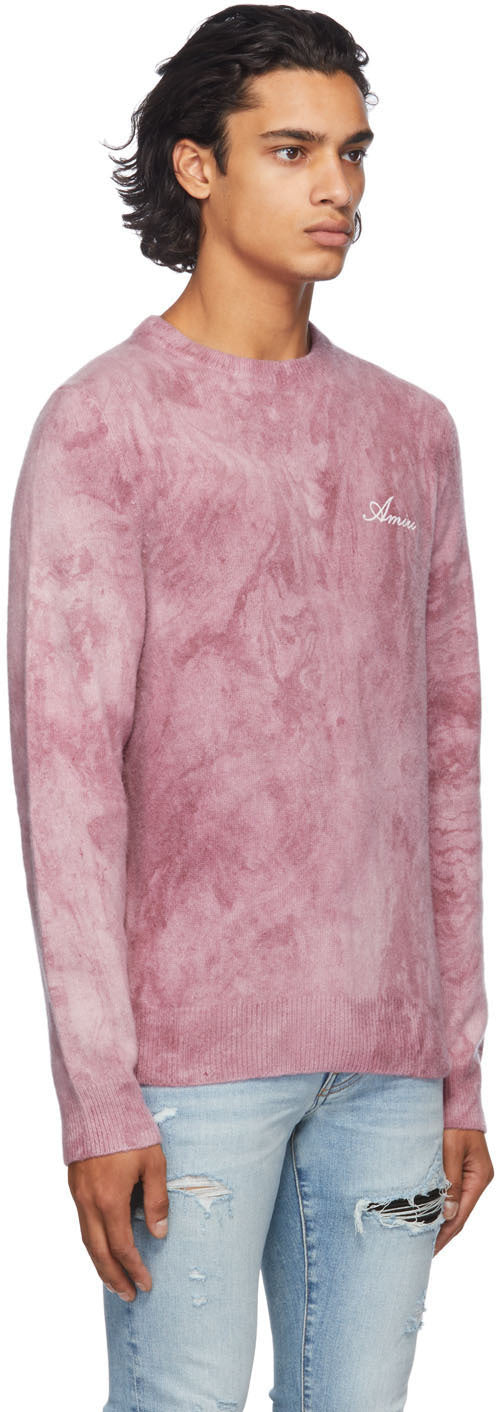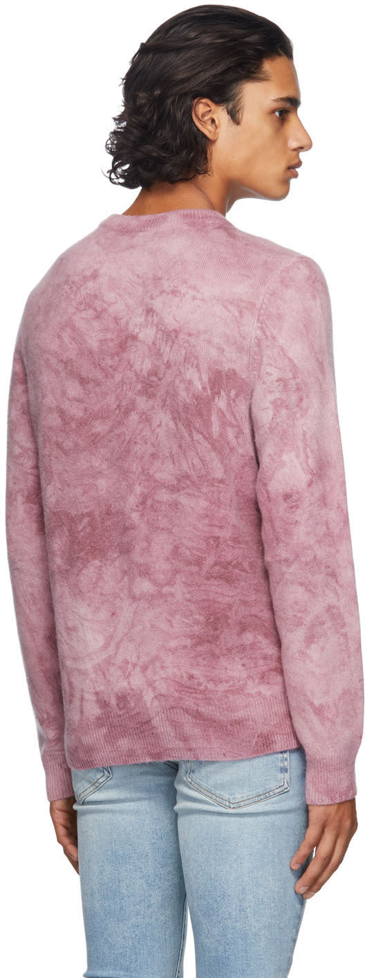 Long sleeve knit cashmere and virgin wool-blend sweater in burgundy featuring tie-dye pattern in tones of burgundy and pink throughout. Rib knit crewneck collar, cuffs, and hem. Logo embroidered in white at chest. Supplier color: Burgundy 97% cashmere, 3% virgin wool. Brand: AMIRI