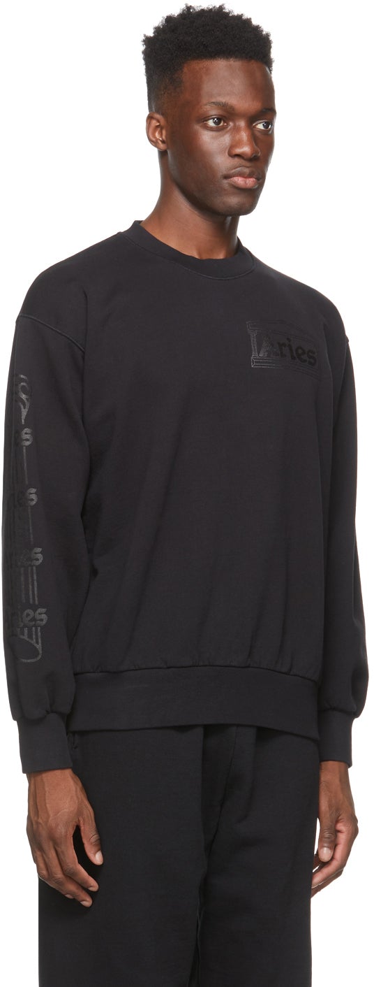 Long sleeve cotton fleece sweatshirt in black. Rib knit crewneck collar. Tonal logo graphic printed at chest and sleeve. Gathering at rib knit cuffs and hem. Dropped shoulders. Supplier color: Black 100% cotton. Brand: Aries